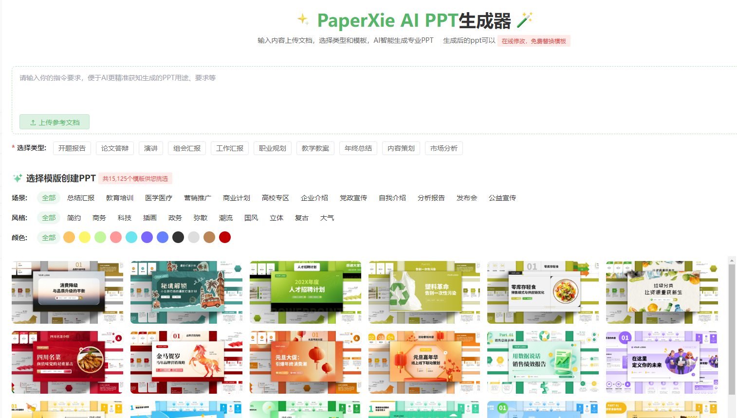 PaperXie 的 AI PPT 生成器以垂直场景深度适配为核心优势,构建了覆盖多领域的模板生态。用户可通过输入需求指令或上传参考文档,明确 PPT 的用途与风格,再结合场景类型选择,快速启动智能创作流程。