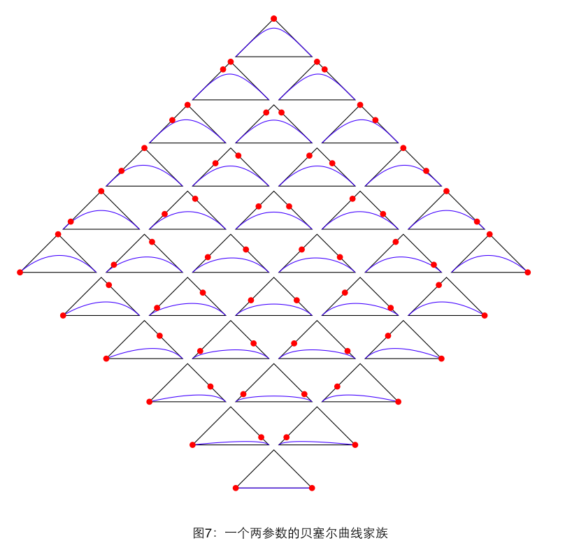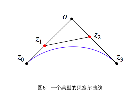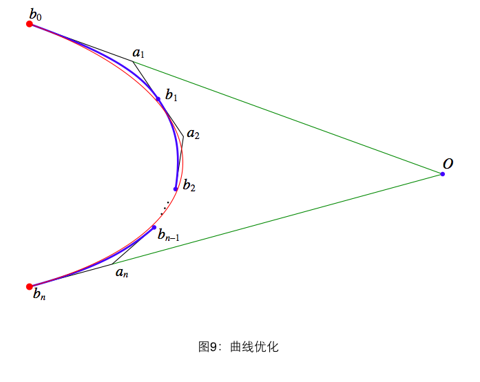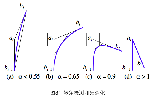 a b b c\] , 其中  2.3.2 一种贝塞尔曲线 此章节的目的是做一个简单,有用的贝塞尔曲线观测。回想贝塞尔曲线由4个控制点z0, z1, z2, z3, 和 参数方程z= (1−t)3z0+3t(1−t)2z1+3t2(1−t)z2+t3z3 给定。为了分析,我们限制通过z0z1和z3z2的直线交叉于点o(即他们不是平行的)。然后,我们限制曲线是凸的且改变方向小于180度;这意味着z1位于z0和o之间,z2位于z3和o之间。这种情况如图6所示。通过一个坐标系的线性转化,我们假定z0 =(−1,0), z3 =(1,0), o=(0,1)。任何这种特殊的贝塞尔曲线都由两个参数决定,a,b ∈ \[0,1\],z1 = (−1+a,a),z2 =(1−b,b)。图7给出了在这种情况下的a和b的值每次乘以0.2的贝塞尔曲线预览。在图中,控制点z1和z2显示为红点。我们可以马上从图中发现贝塞尔曲线在任何特殊水平行上视觉上都几乎无法区分,除了大概a或者b非常接近于0的情况。我们将看到我们的算方法从不产生a,b很小的贝塞尔曲线,这样我们可以避免后面的可能性。于是我们如果我们限制a = b则不会漏掉任何有趣的曲线。这消除了一个角度从我们需要考虑的可能的贝塞尔曲线中,而且这样简化了我们找最优曲线的工作。  我们没有强调我们要求所有的贝塞尔曲线都想图7中显示的那样。不如说这是在线性变化的情况。因此,如果给定z0和z3,这里有两个在o位置的自由度,且一个额外的自由度是a的选择。通过设置a = b,第四个自由度被消除了。  一个有趣的事实是被贝塞尔曲线和x轴包围的面积等于3/10\*(2a+2b−ab) 或 3/10 \* (4−(2−a)(2−b))。由图7我们得出两个曲线看起来很相似如果他们包围的面积相同。因此,我们可以用相等参数  近似任何参数a和b的曲线。 另一个贝塞尔曲线有趣的测量是他的最高点。当a = b,最高点会在t = 1/2的时候达到,而他的y坐标为 3a/4;(这里的a b 是上 图里面的阿尔法 贝塔) 2.3.3 平滑化和转角分析 算法的最后阶段的输入是从章节2.3.1调整后的多边形。假定这个多边形的顶点为a0, . . . ,ak−1。令b0, . . . ,bk−1为多边形边的中点,即bi = (ai+ai+1)/2。对于每个i,我们现在考虑转角bi−1..ai..bi,且我们通过一个光滑曲线来决定是否近似它,如图8(d)所示。 我们如下继续。首先,我们在点ai上画一个单位方形。然后,我们找到平行于bi−1bi的线Li,并在ai的周围接触到方形,且它尽可能地接近直线bi−1bi。令c为Li和 bi−1ai的交点,并令g为bi−1c的长度和bi−1ai的商。令 a = 4g/3 并 考虑贝塞尔曲线(章节 2.3.2所考虑的那种)链接bi−1 和bi 用参数a。这条曲线切线于bi−1ai, Li, aibi 这3条线。 我们使用刚刚计算的参数a来进行转角检测盒决定最终从bi−1 到 bi的曲线。这里有两种情况。 如果 a ≤ 1,然后我们绘制一条光滑的贝斯阿尔曲线在这个顶点,如图8(a)-(c),如果 a \> 1,这里没有凸的贝塞尔曲线来链接bi−1 和 b 并切线于Li。在这种情况下,我们检测了一个转角且我们通过两条相交于点ai的直线片段链接bi−1 和 bi ,如图8(d)所示。 转角检测可以通过转角阀值参数amax来定义,通过--alphamax命令行选项来设置。如果这个参数有被设置,那么顶点将为圆角 如果 a< amax, 如果a \> amax则是一个转角 。因此,更小的amax会导致更多的转角,如图1(b)所示,更大的值则会导致更多圆角,如图1(c)所示。默认的amax = 1。 如果amax = 0,没有平滑化会执行Potrace的输出为一个多边形。如果amax \> 4/3,将会完全没有转角,输出全都是光滑曲线。 检测完转角以后,a的值被调整为0.55 和 1 之间。a \> 0.55 是为了阻止曲线太"平"。让 a \< 0.55常导致奇怪的图像。a \< 1是为了保证结果贝塞尔曲线是凸的。 a = 0.55被选择是因为它会导致圆形物的良好近似在输出时一个正常多边形的情况下。它被选择是因为理论值 a0 =4/3(√2−1) ≈ 0.552285 它通过一条贝塞尔曲线对1/4圆有着最好的近似。更精确地讲,这条贝塞尔曲线有着坐落于半径为1.00027253单位圆中的控制点z0 = (1,0), z1 = (1,a0), z2 =(a0,1), 和 z3 = (0,1)。因此,这条曲线偏离一个真正的圆(1/4圆)不到0.01363%。虽然贝塞尔曲线片段对1/4圆的近似众人皆知,但准确地范围很难在文献中找到;比如,Faux 和 Pratt 错误地给出了0.13%的值,这应该 是显然的印刷错误,反之Knuth给出它只"比0.06%要小"。 注意我们的转角检测算法有如下属性:尖锐的角度和长片段更有利转角。因此,我们检测一个转角如果两个短片段相交于一个很小的角度,或者两个很长的片段相交于一个轻微的角度。 2.4 曲线优化 前一个阶段在转角检测和光滑化之后,输出地是由贝塞尔曲线片段和直线片段构成的。结果曲线非常接近Potrace的最终结果。但是,这里算法仍然有一个最后的优化,曲线优化阶段,即尝试通过连接临近的贝塞尔曲线来优化。曲线优化仅仅对最终曲线产生非常小的改变;小到一般看不出区别。但是,结果曲线会由更少的片段构成,所以程序输出会以更紧密的方式显示。如果曲线优化是不需要的,可以通过--longcurve命令行选项来设置。 曲线优化基于几个简单的想法。首先,我们仅仅尝试去连接临近的曲线片段,绝不连接直线片段或者转角。第二步,我们只连接角度凸的曲线片段,即他们都向右或者向左弯曲。三,我们连接总的方向改变少于179度的曲线片段。(我们没有允许180度是为了避免在下面计算不受控制)。这使我们要考虑如图9蓝色显示的片段序列。  问题是我们是否能找到一条单个贝塞尔曲线来近似给定的一组更短的贝塞尔曲线。假定这里有这样的一