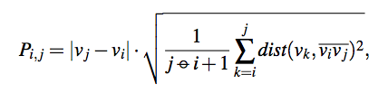 在片段数相同的多边形当中,有一些仍然比其它的更好。我们赋予每个片段一个惩罚。给定一个从 i 到 j 的片段,记直线片段ViVj(如图5蓝线)。赋予这个片段的惩罚等于ViVj的欧几里得长度乘以路径上每个点到ViVj欧几里得距离的标准偏差。即公式如下:
