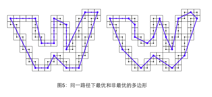 已找到所有可能的多边形,现在我们想要找到一个最优的。我们对最佳性的主要标准是片段的数量:一个拥有更少片段的多边形被认为是比更多片段多边形更优的。在图5中,左边多边形有14个片段,而右边的有17个片段。因此左边的比右边的更优