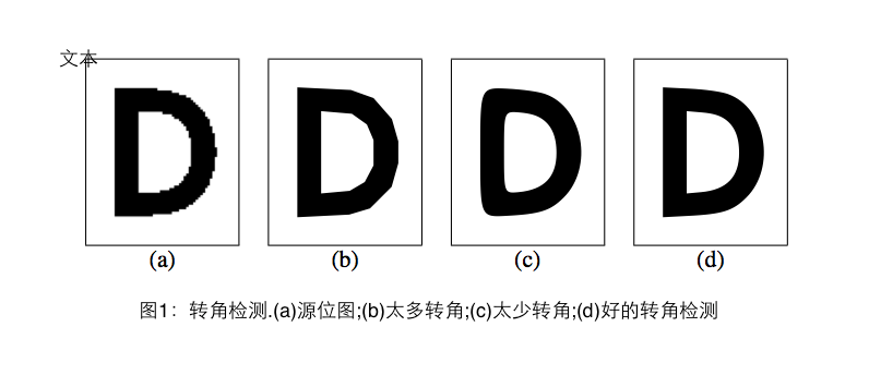 每一个矢量化算法都得有几个步骤。其中两个是找到最合理地近似轮廓的曲线,并检测转角。在这两个目标里有一个权衡。如果检测出太多转角,结果会看起来像多边形而不再光滑。如果检测出太少转角,结果会看起来光滑但太圆滑。图1显示了一个例子。