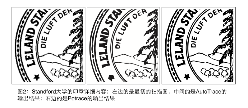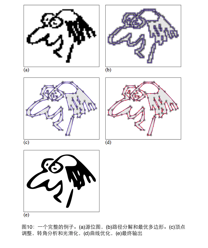在这片论文里,我们描述了一种简单,高效并产生极好结果的轮廓矢量化算法。这个算法被称作Potrace,表示多边形绘图。然而这个算法的输出并不是一个多边形,而是一个由贝塞尔曲线构成的光滑轮廓。算法的名字来源于他使用多边形来当做中间层呈现图像的事实。