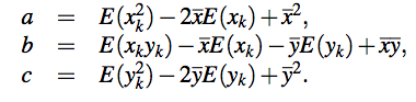 计算ak 很容易,它只是简单总计去在一个正方形内最小化一个二次函数。并且,通过使用一个标准方法"best fit"很容易计算从点vik , . . . , vik+1 到直线Lk,k+1 :这条线通过重心(E(xk),E(yk))即 k = ik,...,ik+1,并且它的斜率由下面矩阵更大特征值的特征向量给出。