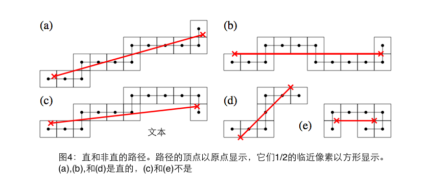图4显示了一些直和非直的路径。注意图中,那些点表示源位图坐落于转角而非中心的顶点。显示的正方形不是像素,而是路径点周围像素。(注2)