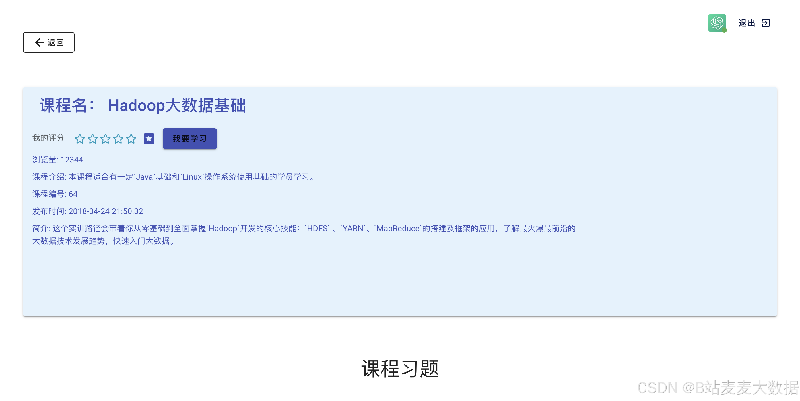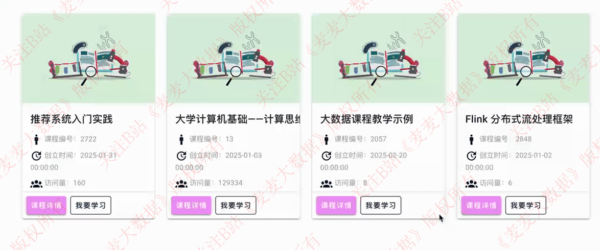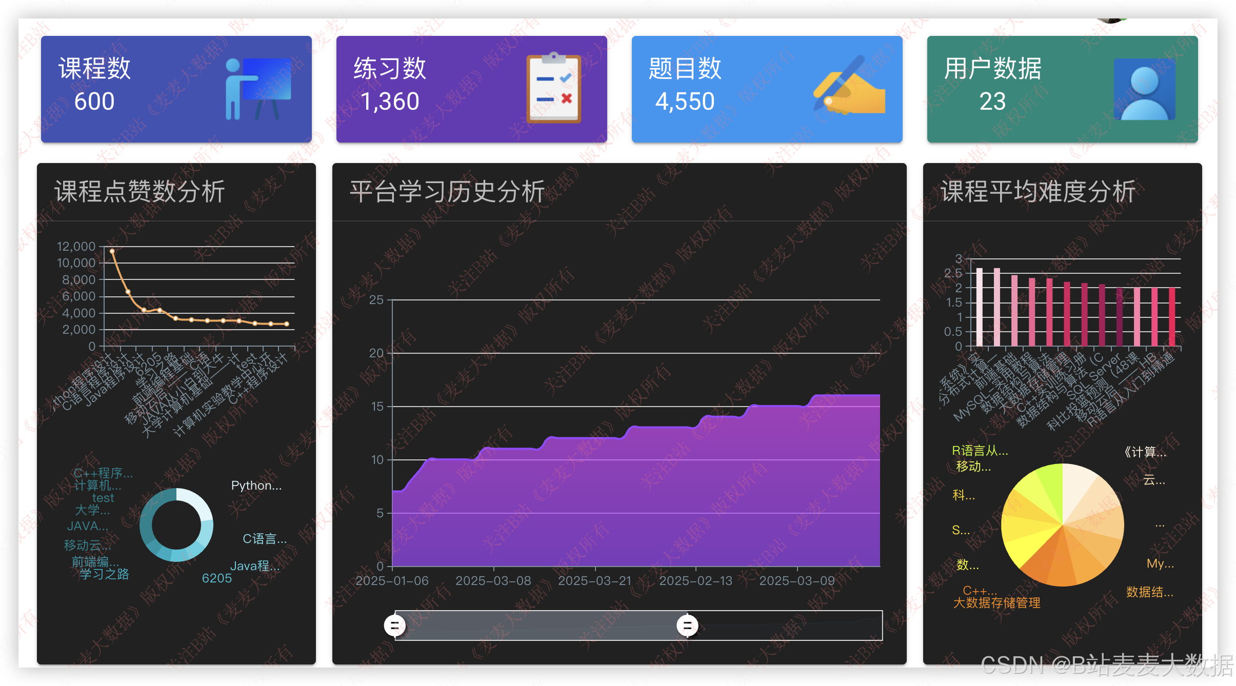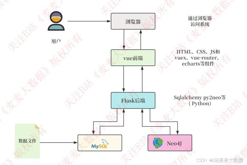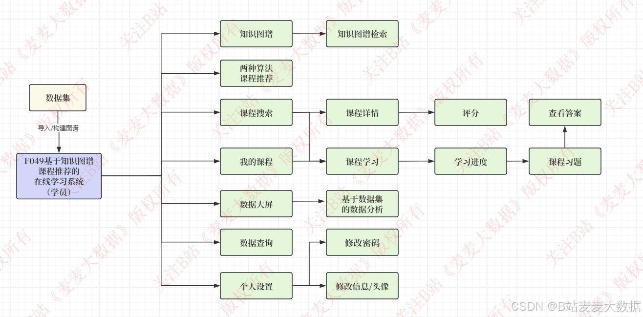系统简介:本系统是一个基于Vue+Flask+Neo4j构建的在线学习知识图谱双算法推荐系统。其核心功能围绕知识图谱构建、课程推荐、学习管理以及用户交互展开。主要功能模块包括:课程知识图谱可视化,通过图数据库Neo4j构建课程、主题、知识点等实体的关联关系,并提供模糊搜索功能;双协同过滤推荐算法,基于用户行为和课程内容推荐相关课程;课程学习模块,支持课程浏览、习题练习、学习进度跟踪等功能;数据大屏,通过ECharts展示学习行为分析和知识点分布;用户管理模块,包含注册、登录、角色管理及权限控制;个人信息管理模块,允许用户修改个人信息、头像和密码,确保系统的安全性和个性化体验。