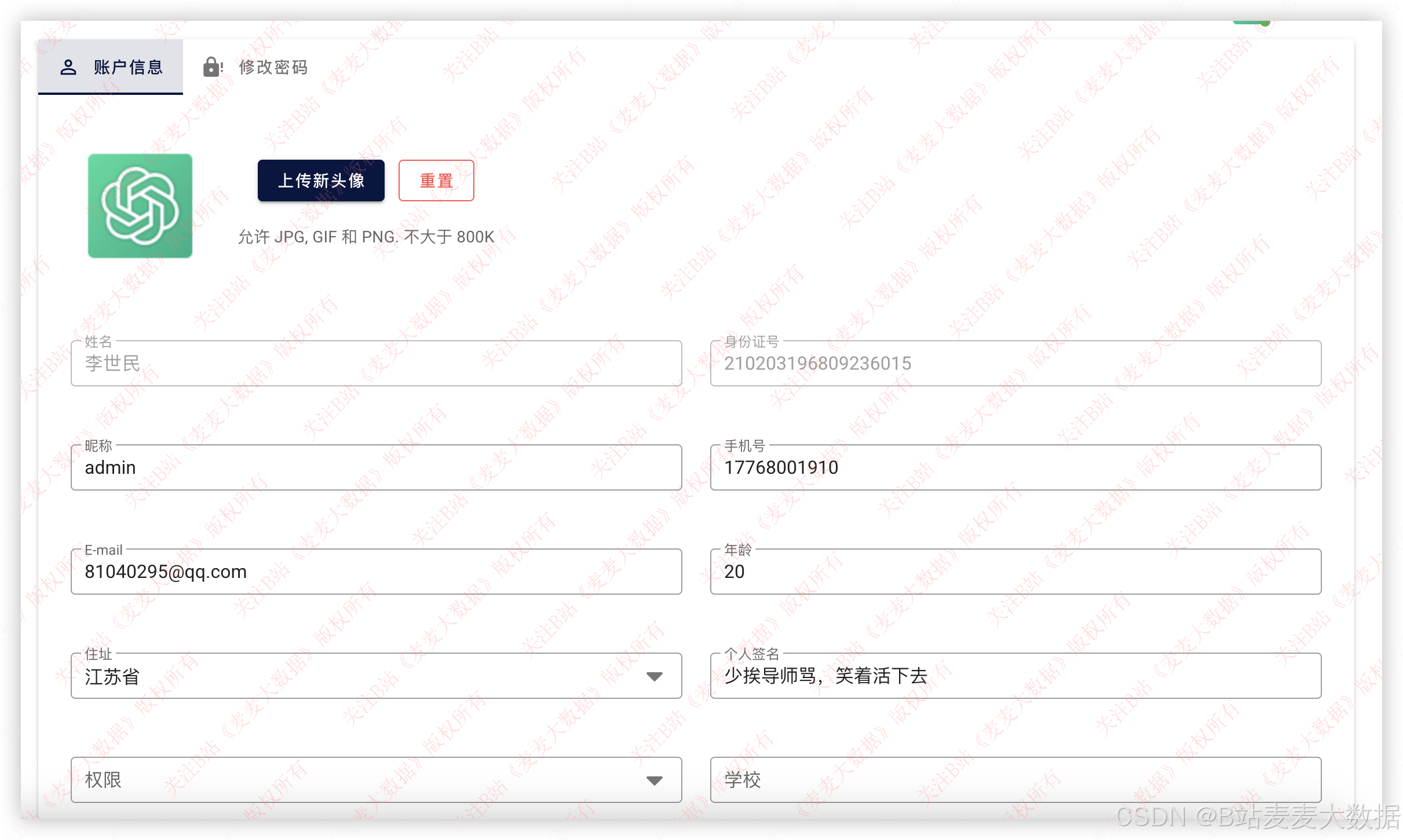 用户信息修改中可以上传头像,完成用户的头像个性化设置,也可以修改用户其他信息。