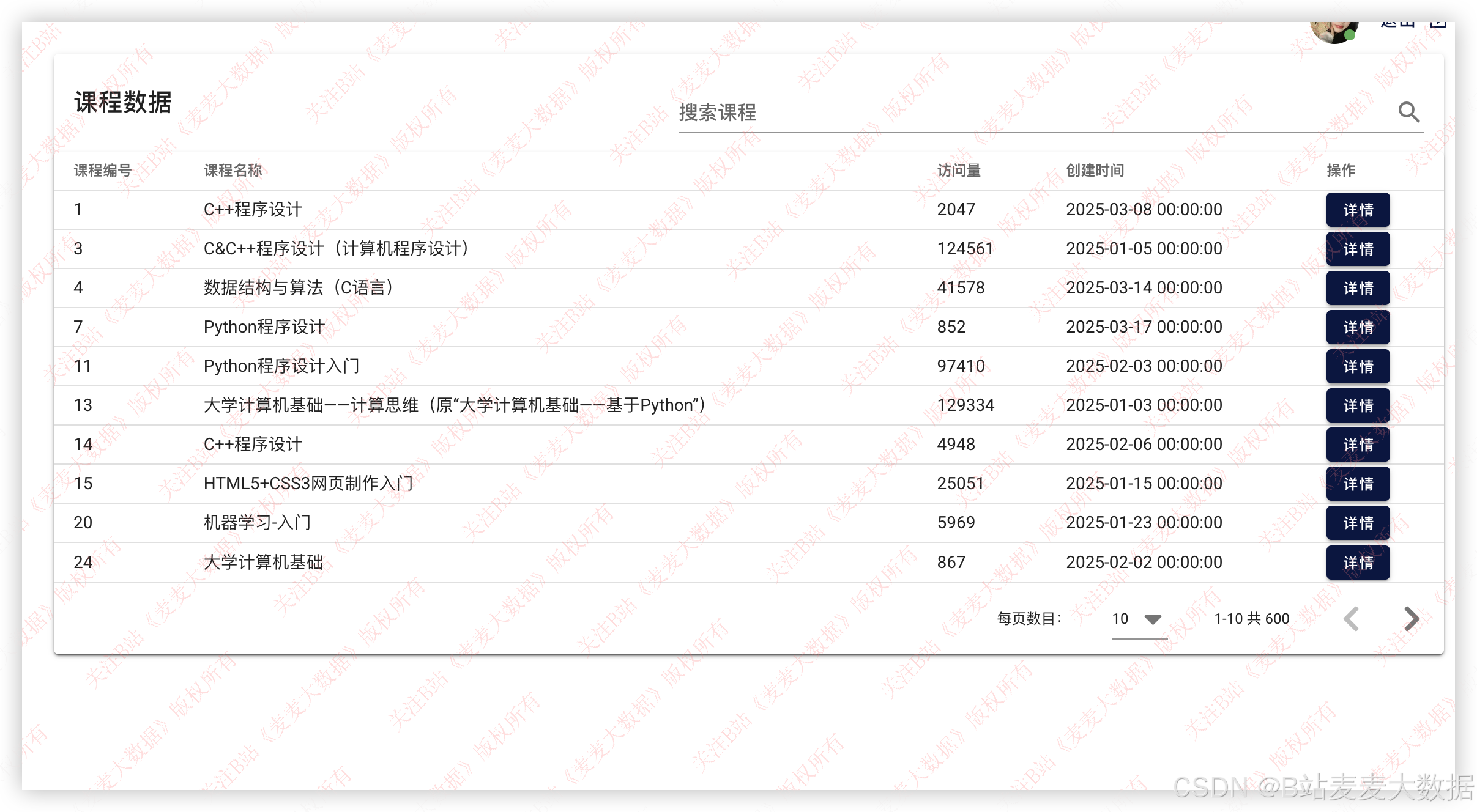 在推荐功能方面,系统采用双协同过滤算法,结合用户行为数据和课程内容特征,提供个性化的课程推荐。知识图谱构建模块从MOOC教育数据集中提取课程、主题、知识点等信息,通过Py2neo将数据导入Neo4j,构建多层次的知识网络,并支持模糊搜索和可视化展示。课程学习模块支持"添加到我的课程"、"取消学习"、"查看学习进度"等功能,学习记录同步更新MySQL和Neo4j数据库。数据分析模块通过ECharts生成数据大屏,展示学习行为和知识点关联强度等信息,为管理员提供数据支持。管理员界面实现用户管理、角色管理,个人中心支持修改信息、头像和密码,确保系统的安全性和用户体验。