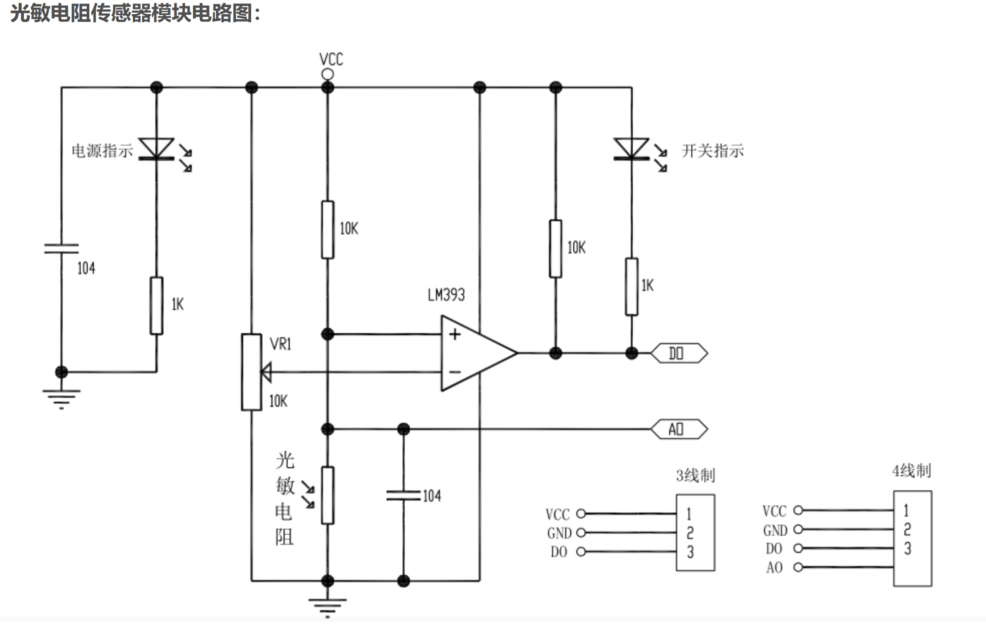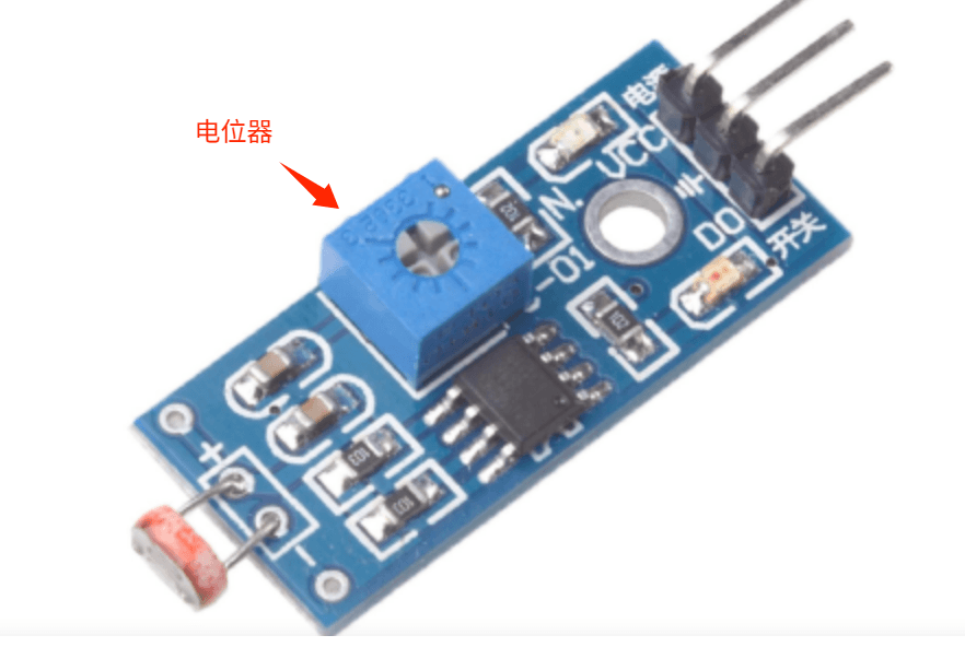 光照光敏电阻,**光照,电阻变小,同相输入端变小,比较器输出低电平。**光敏电阻模块上也有提示灯,在光照变化会亮灭,控制的led灯也会亮,可以通过调整电位器使得处在一个敏感的位置(调节到提示灯由亮灭之间切换的那个点最灵敏)或者找一个可变亮度光源。