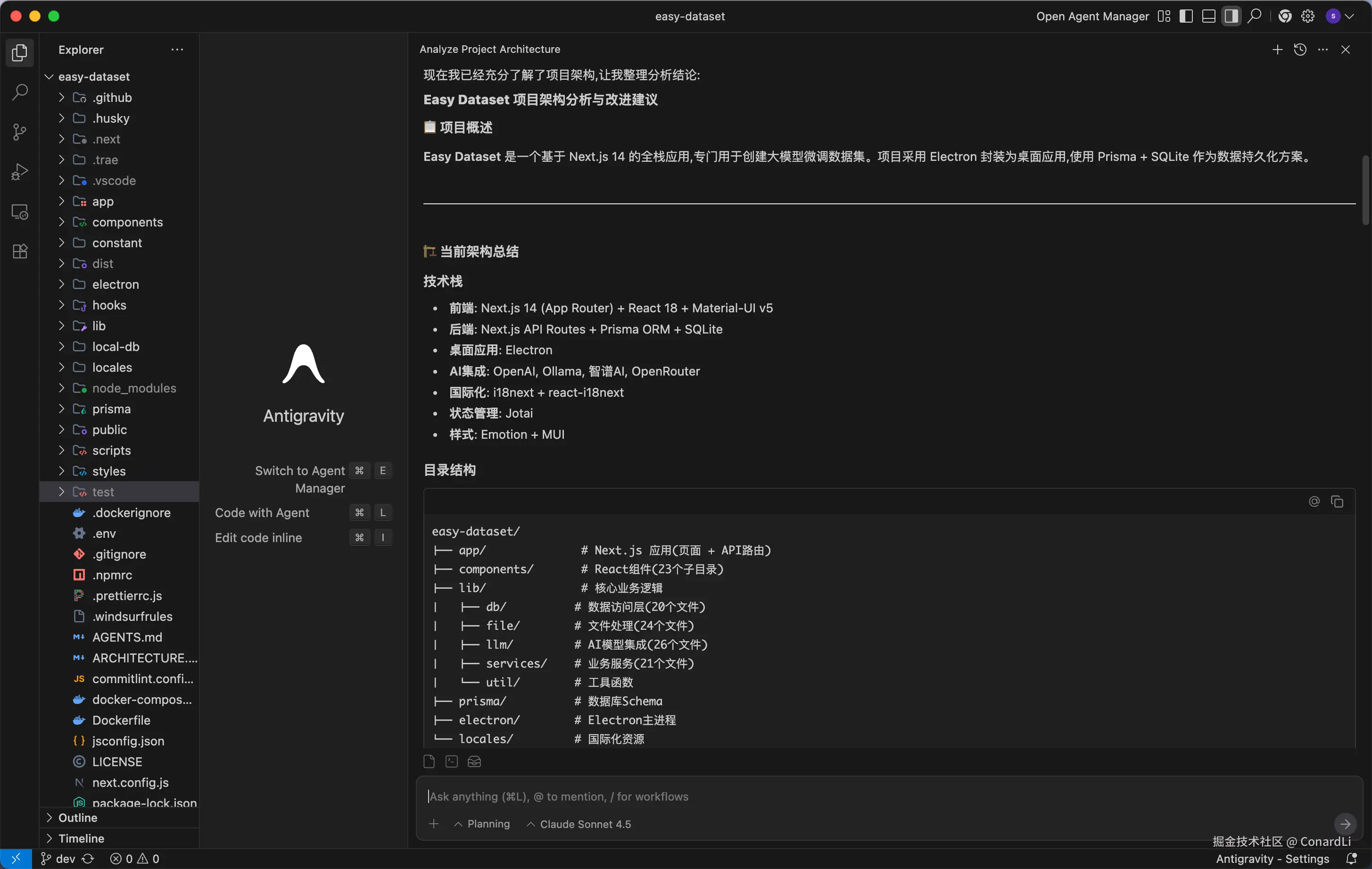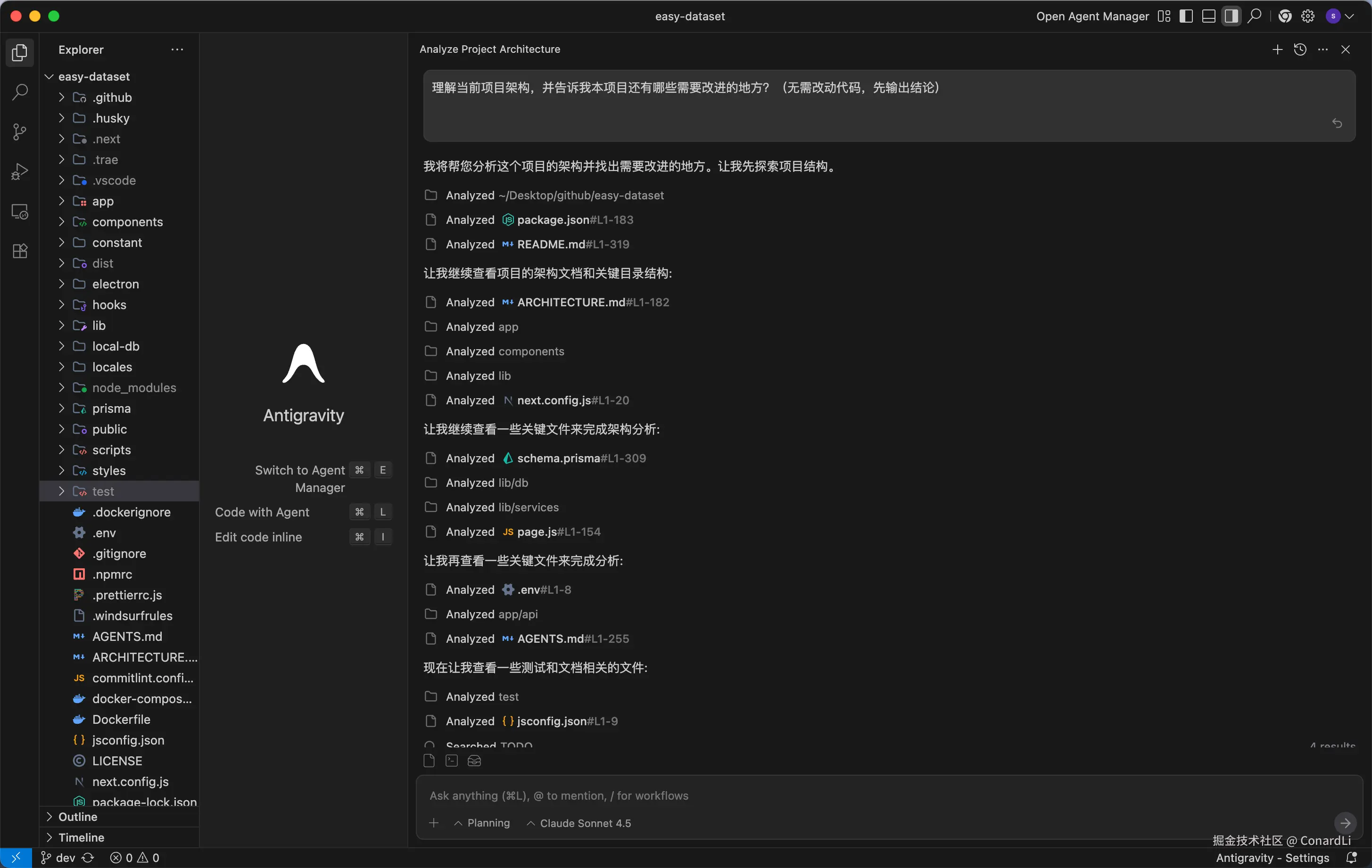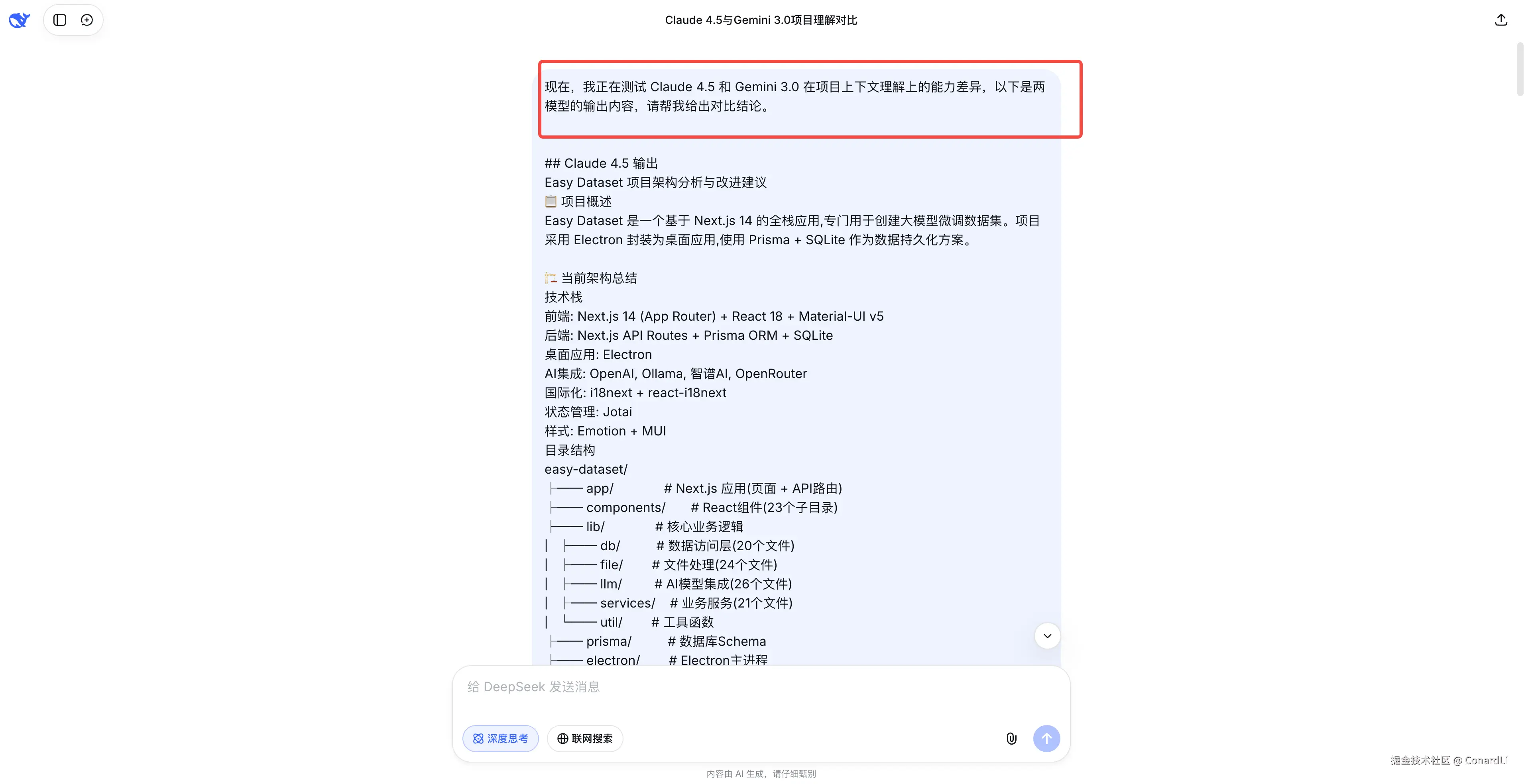 第一局,我们来测试一下模型的项目理解能力,我们让他对一个大型的项目,进行整体的分析和产出优化建议,我们选择 Easy Dataset 这个项目。