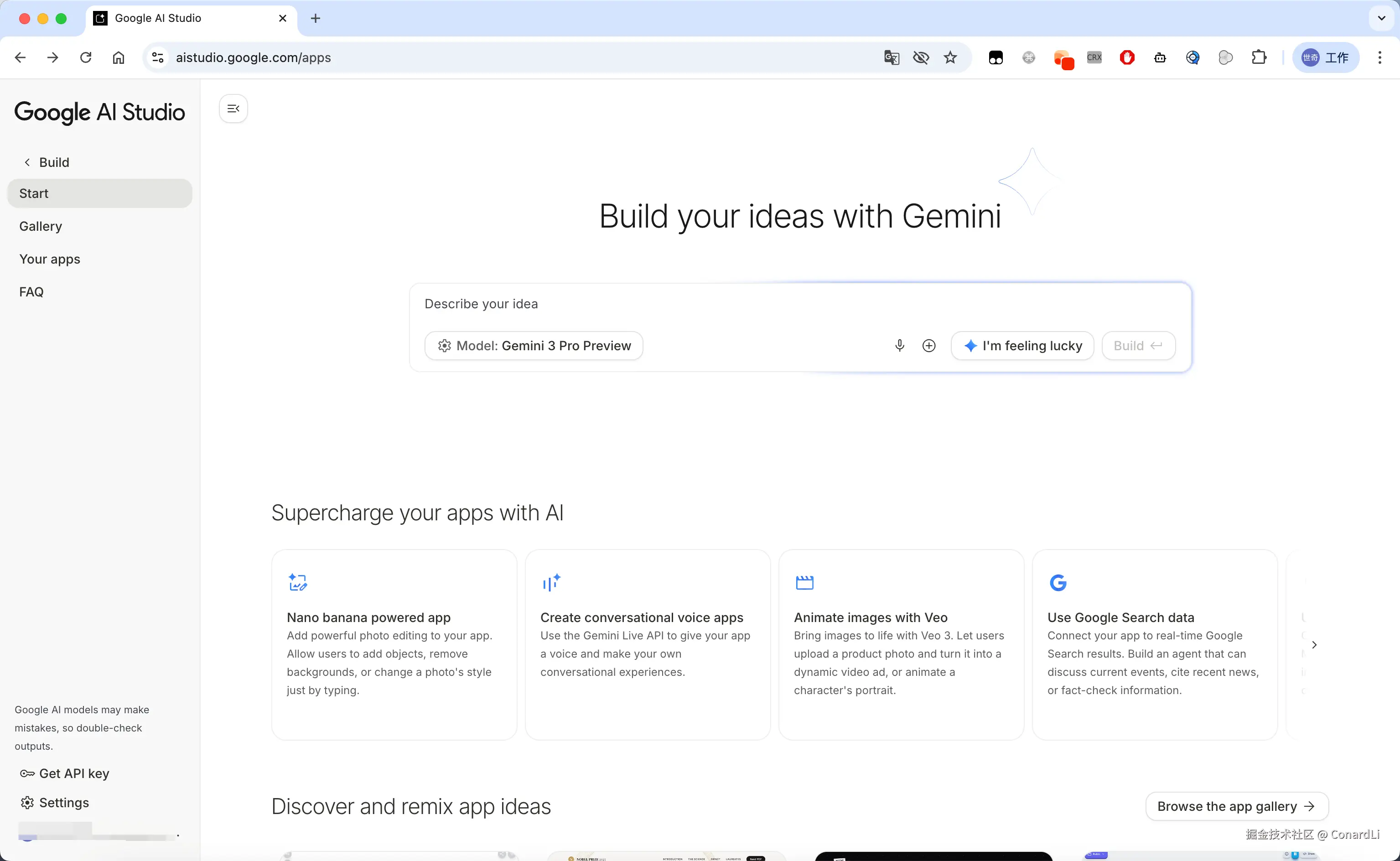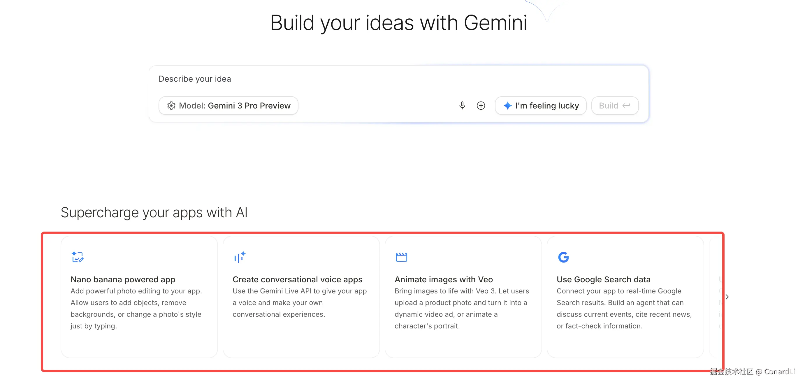 下面,我们开始测试开发能力,这时我们可以到 Google AI Studio 的 Build 功能,这其实是一个在线的 AI Coding 工具,帮你快速把想法变成可运行的网页。