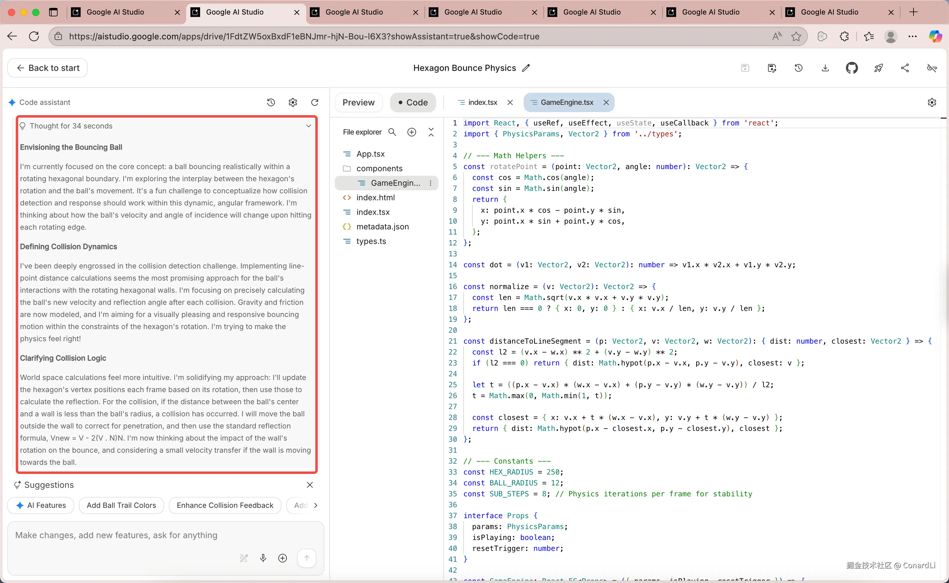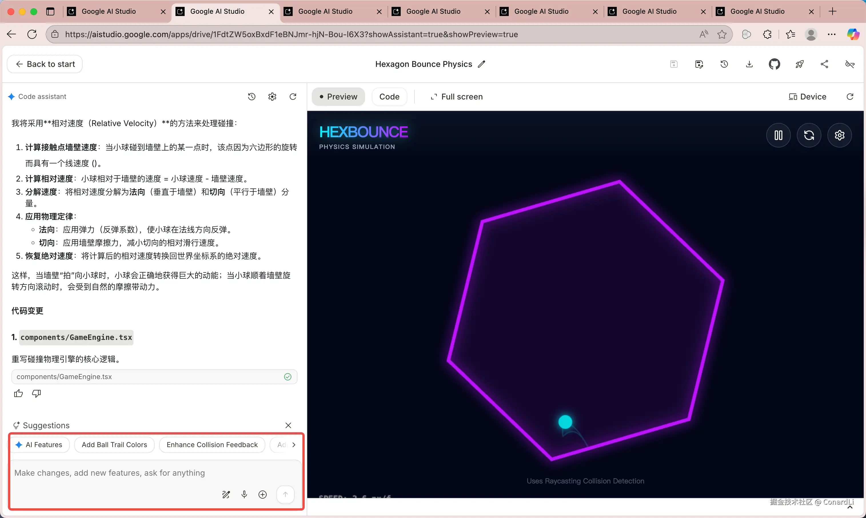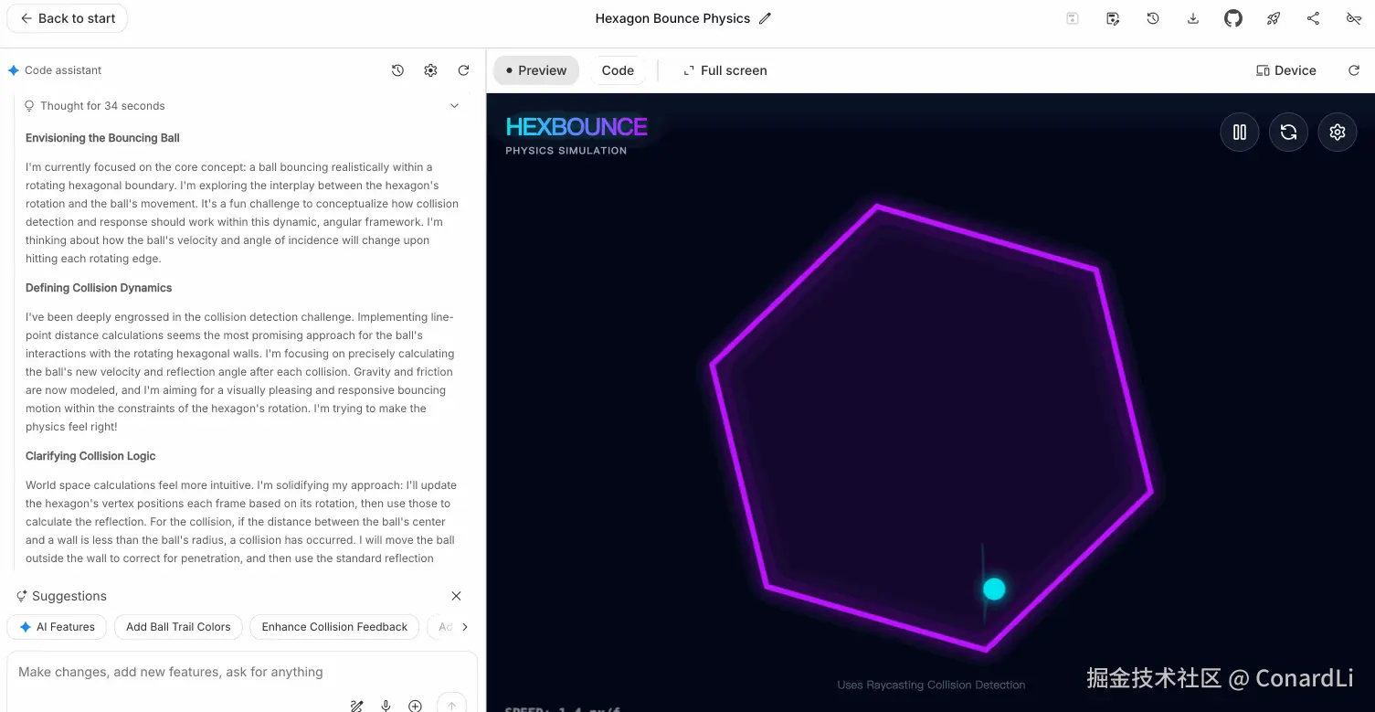 生成完成了,我们来看一下效果,可以发现 Gemini 对物理规律的理解是非常不错的,而且页面样式和交互体验也不错。