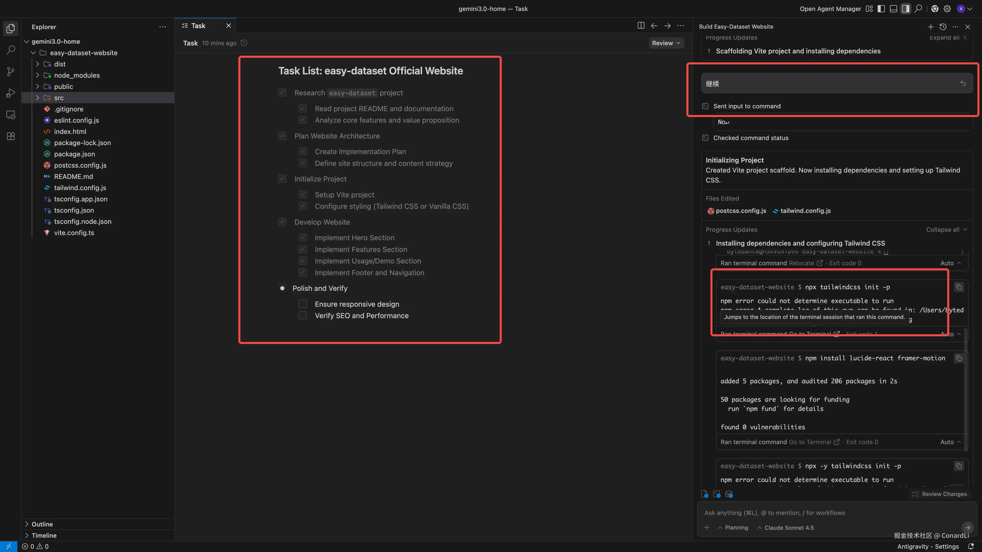 首先看 Gemini 3.0 的生成效果,列出的项目计划是这样的,然后中间中断,手动继续了一次,后使用 tailwindcss 的脚手架模版创建了这个项目,在最后的自动化测试环节也是没有完成的。