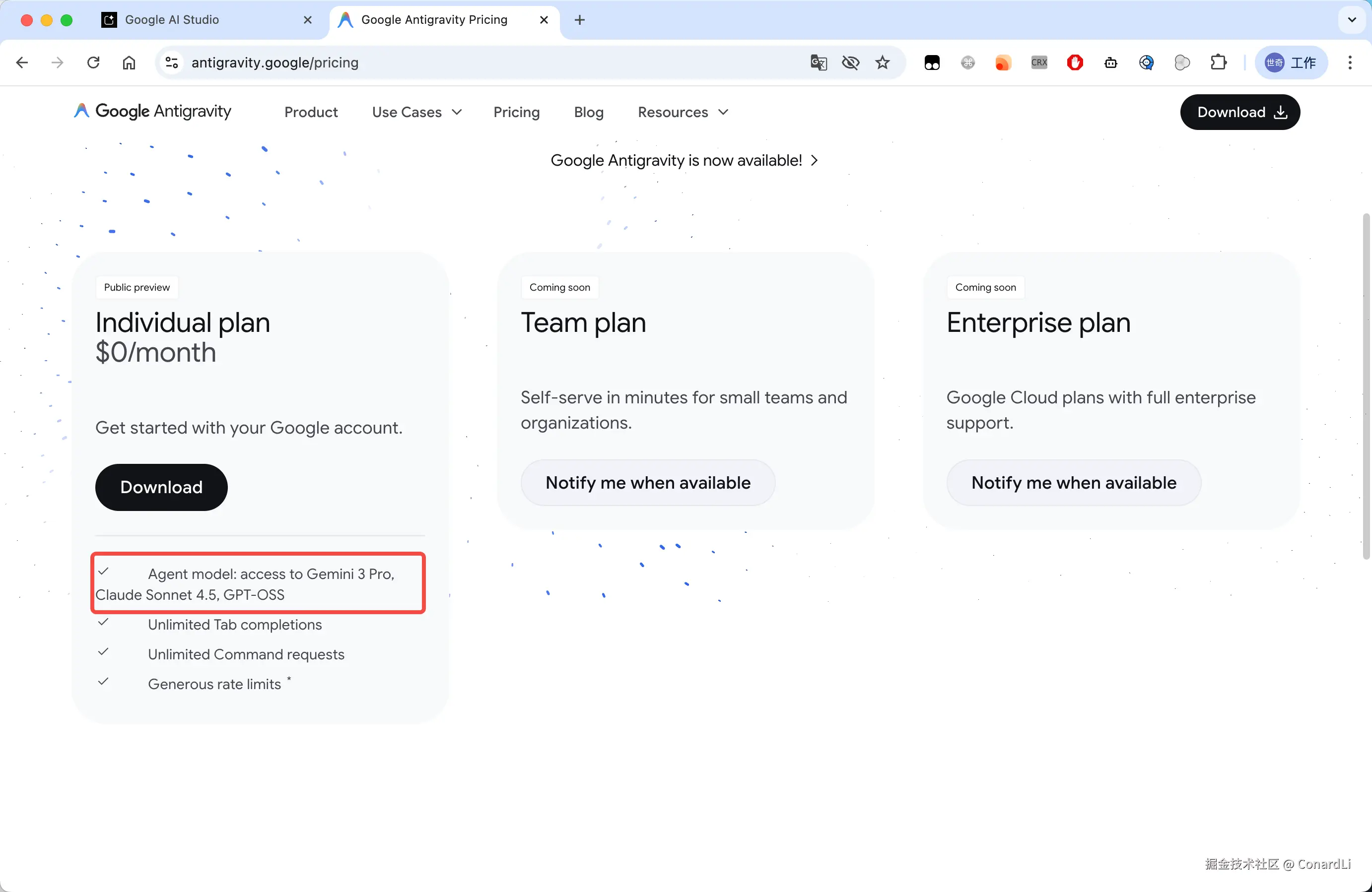 目前可以直接白嫖 Gemini 3 Pro 和 Claude Sonnet 4.5(不过需要美区 Google 账号):