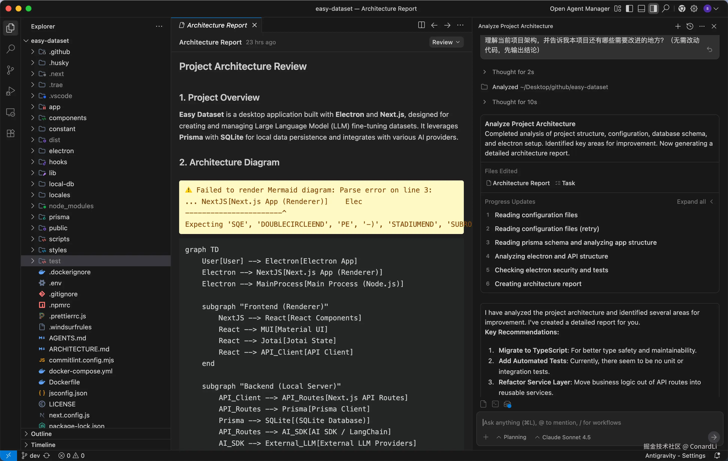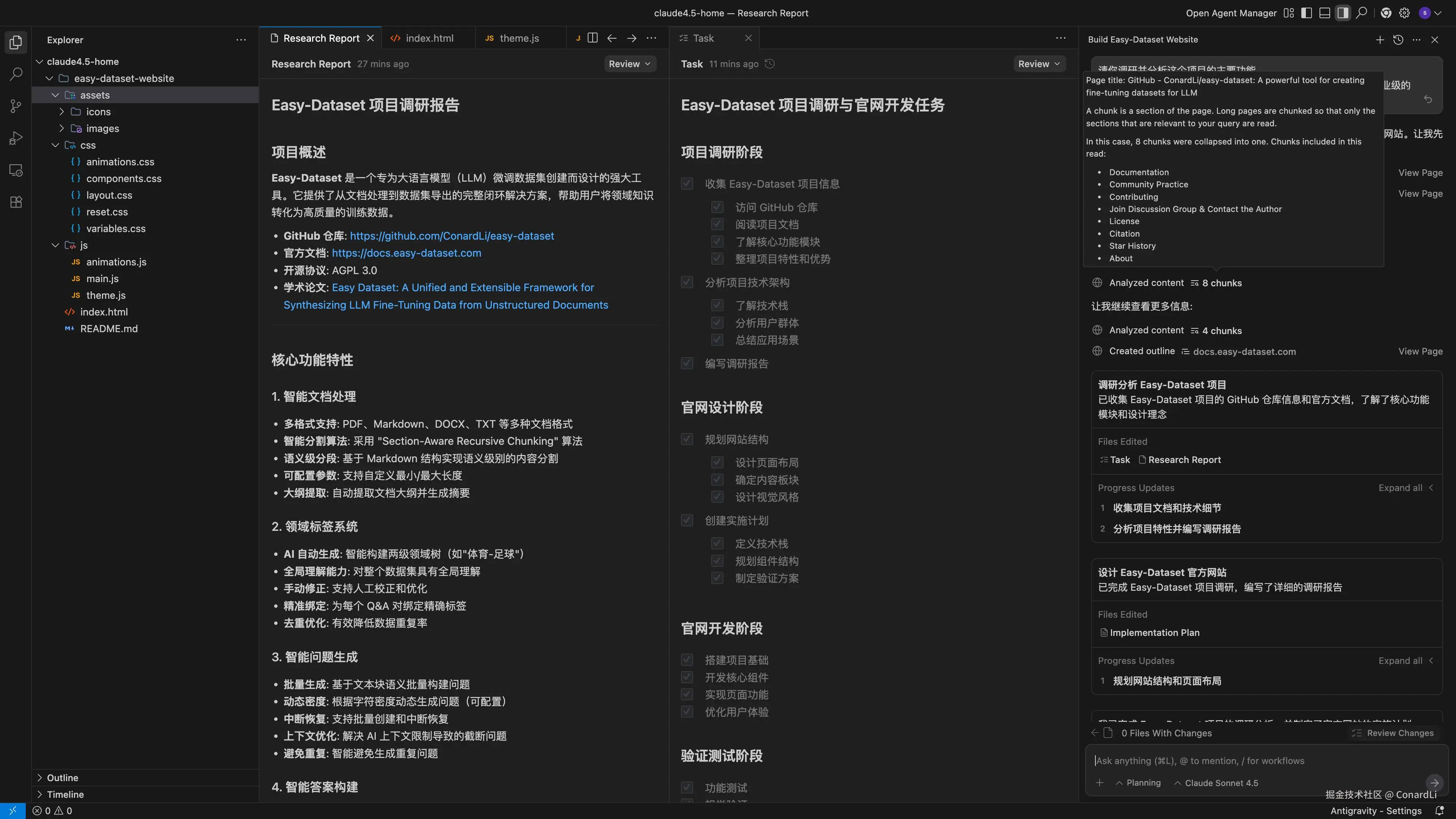 然后我们来看 Claude 4.5 生成的结果,首先他生成的一份非常详细的开发计划,然后对 Easy Dataset 项目进行了调研,然后产出了一份调研报告后才开始开发。任务是一次就完成了,中间没有任何中断,然后他没有选择使用脚手架,而是从零创建了项目代码,最终也顺利完成了自动化测试。