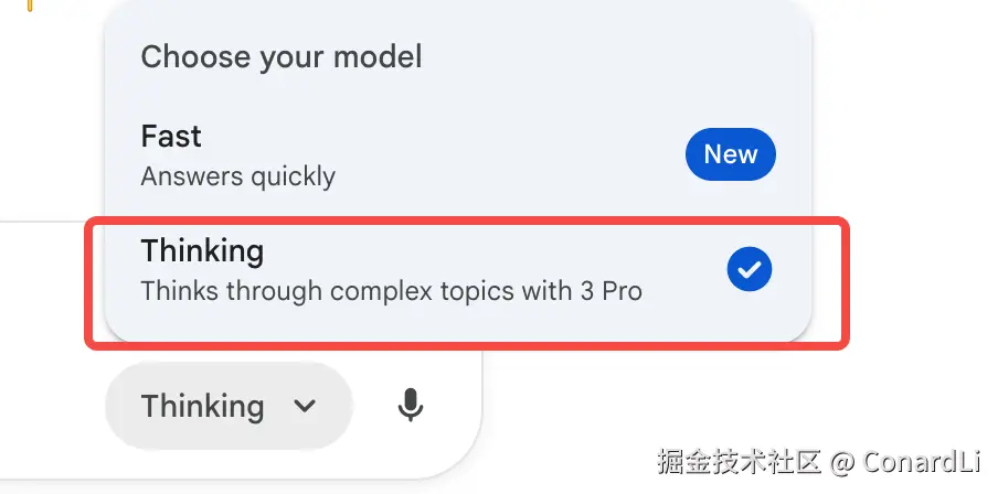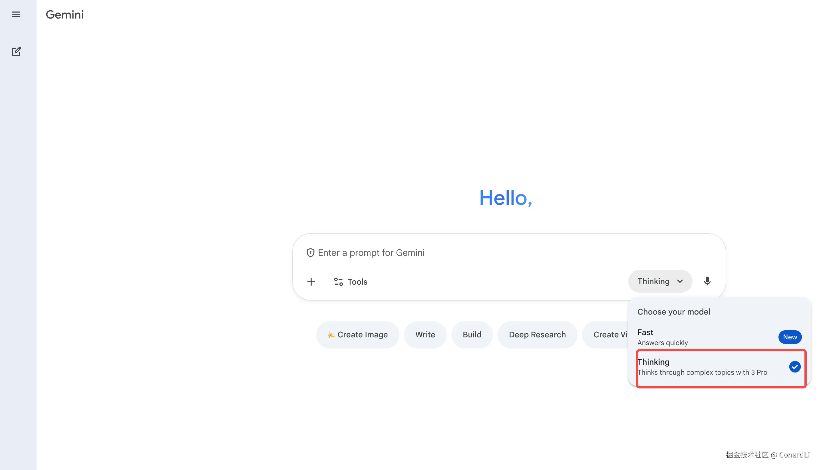 我们先来进入 Google Gemini 网页版,测试一下最基础的中文写作能力,我们在右下角切换到 Thinking 模式,即可使用最新的 Gemini 3.0 的推理能力: