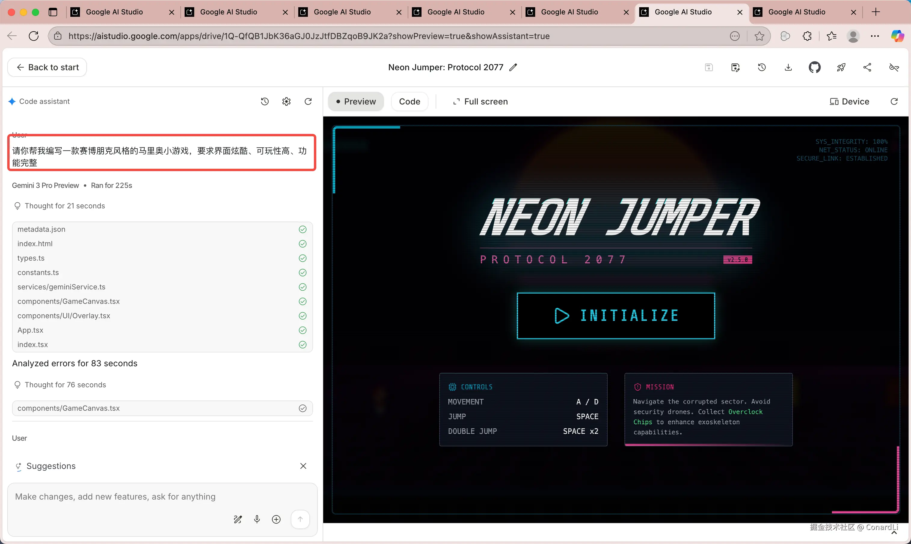 特别是在有了 AI Studio Build 这种工具的加持,让他在从零生成一个 Web 应用这个场景下更是是如虎添翼。另外,在指令遵循,需求理解的能力上,相比上一代的 Gemini 2.5 确实是有了很大幅度的增强。