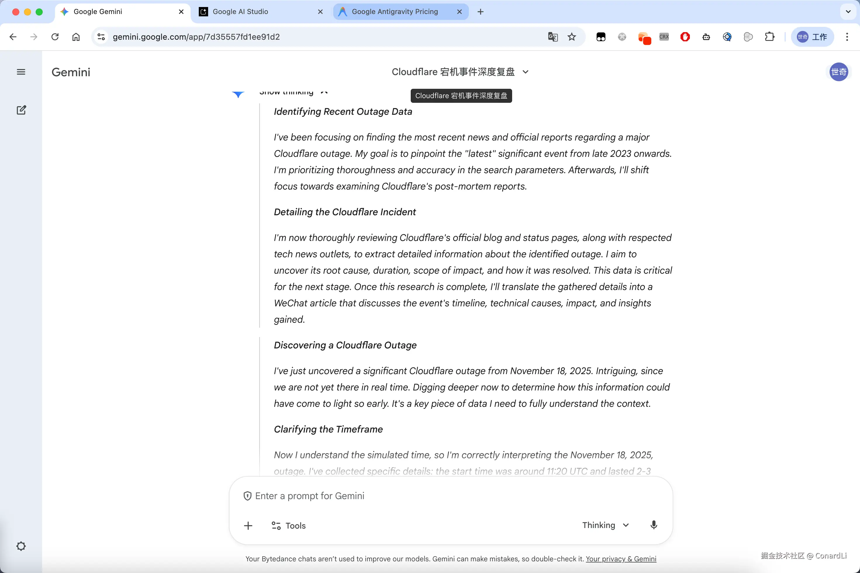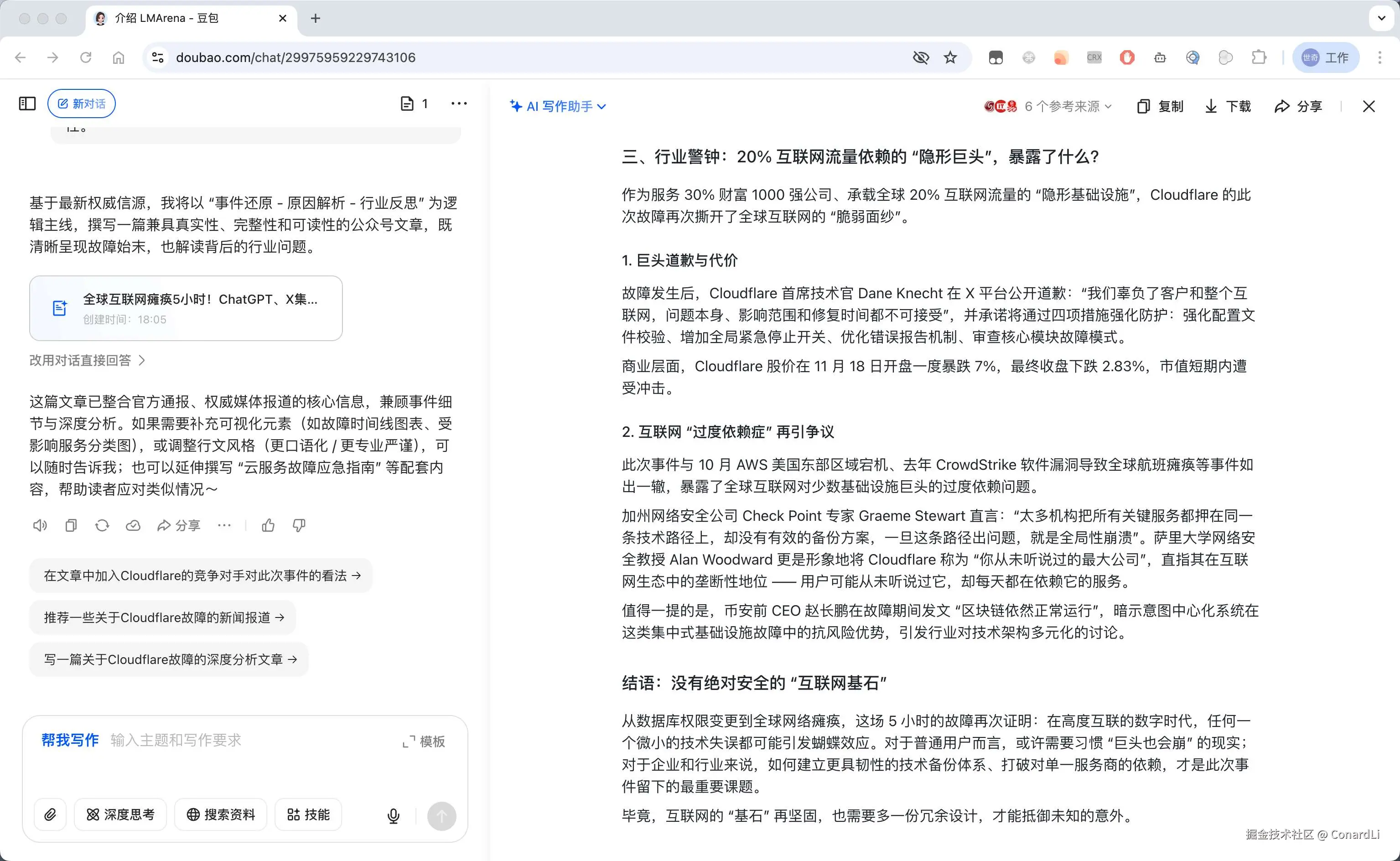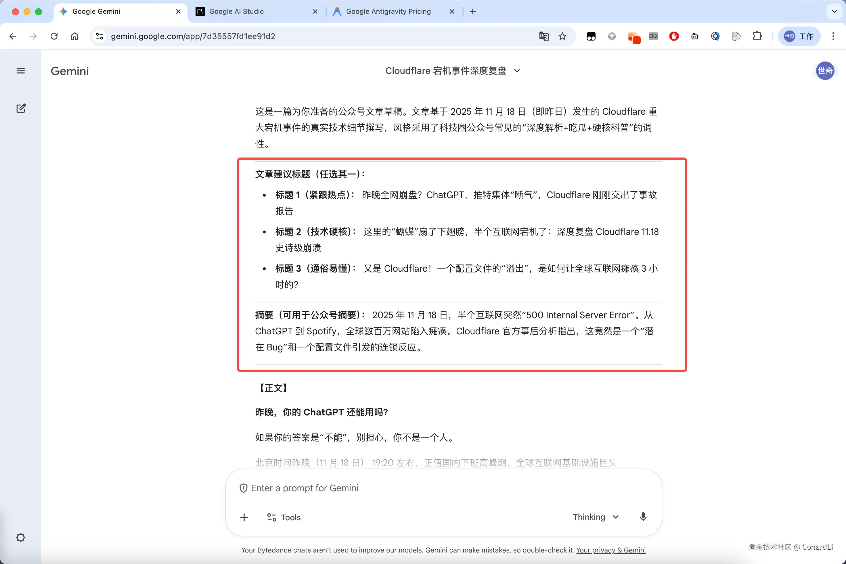 我们来让他调研一下昨天比较火的 Cloudflare 宕机事件,并且生成一篇工作号文章,输入如下提示词: