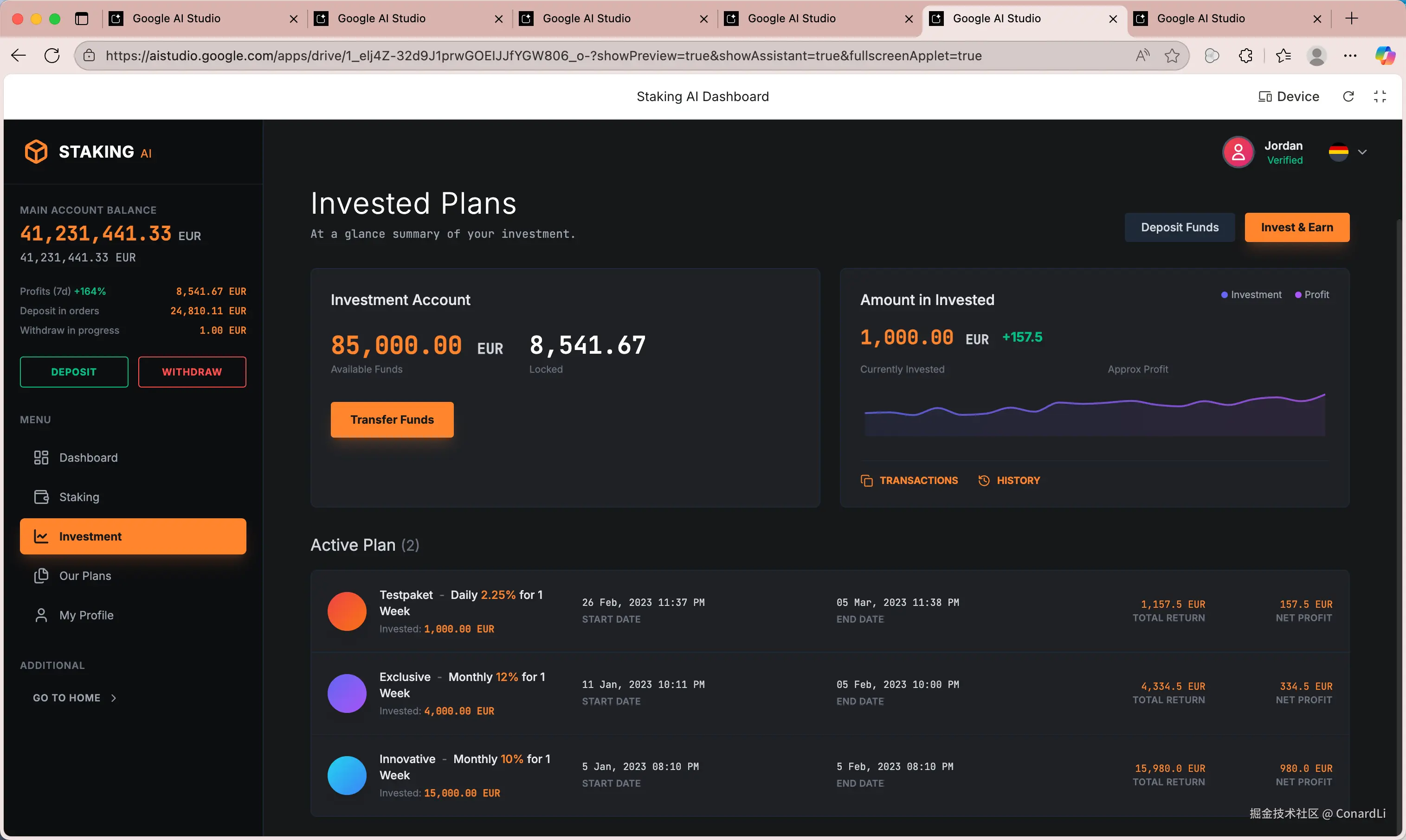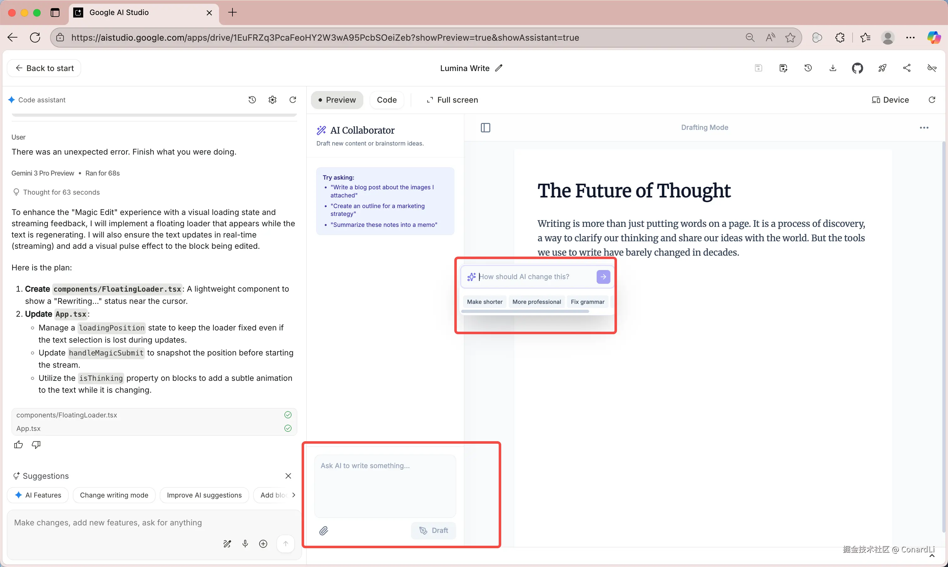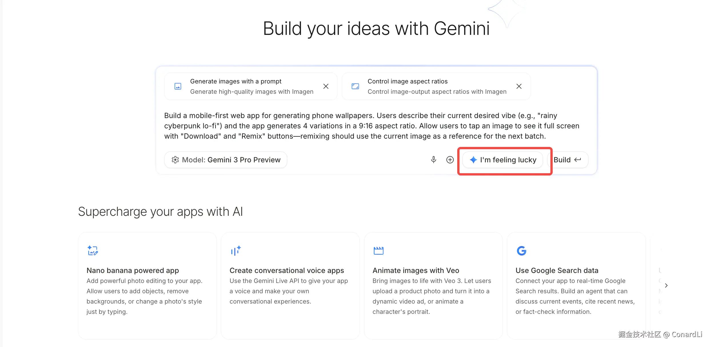 在 Build 模式下,还有个非常有意思的功能,I'm feeling lucky,点击这个按钮,它会自动帮我生成一些项目灵感,如果你支持想尝试一下 Gemini 3.0 的强大能力,但不知道要做点啥,这就是一个不错的选择:
