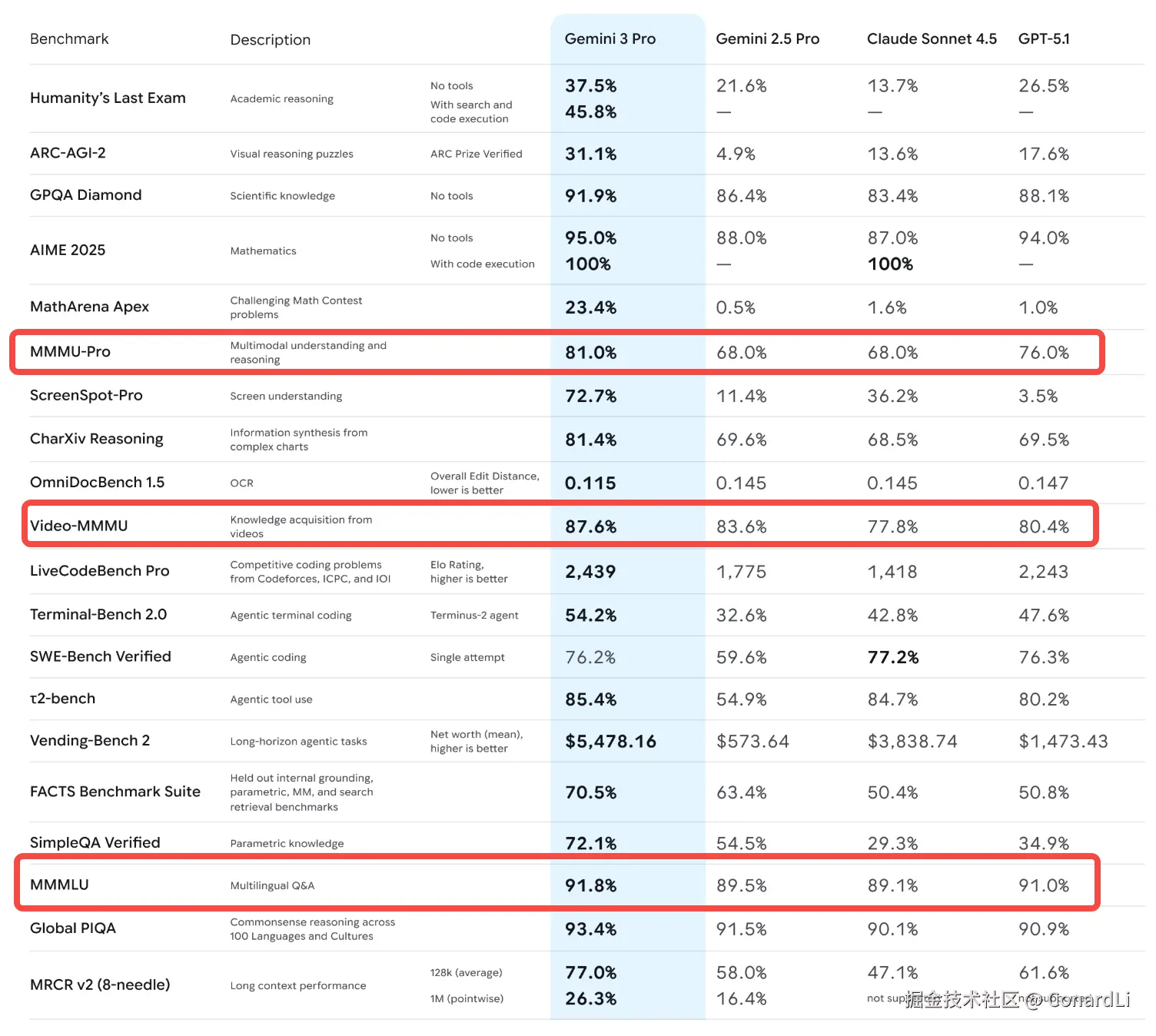 Gemini 系列一直以原生多模态(Native Multimodal)著称,Gemini 3.0 更是将这一优势发挥到了极致,它在 MMMU-Pro 和 Video-MMMU 上分别斩获了 81% 和 87.6% 的高分,全面领先其他模型。