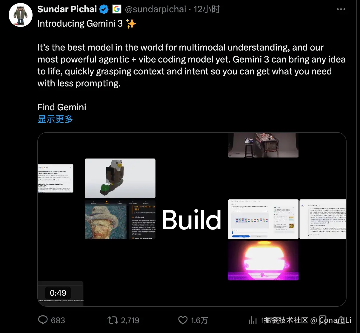 Sundar Pichai 在 X 上自信宣称:"Gemini 3.0 是世界上最好的多模态理解模型,迄今为止最强大的智能体 + Vibe Coding 模型。它能将任何想法变为现实,快速掌握上下文和意图,让您无需过多提示即可获得所需信息。"