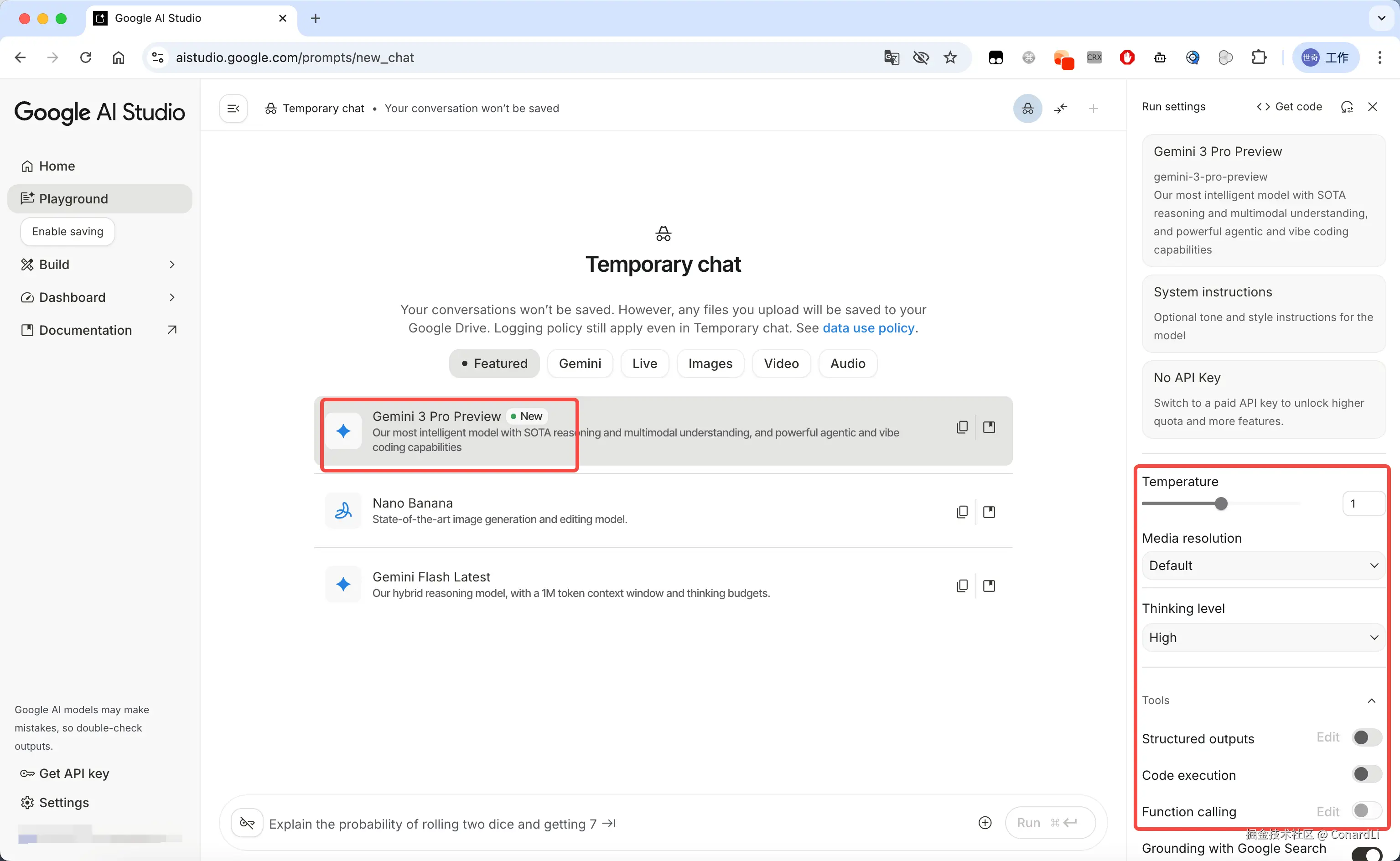 gemini-3-pro-preview)可以更改模型参数,进行基础对话和工具调用: