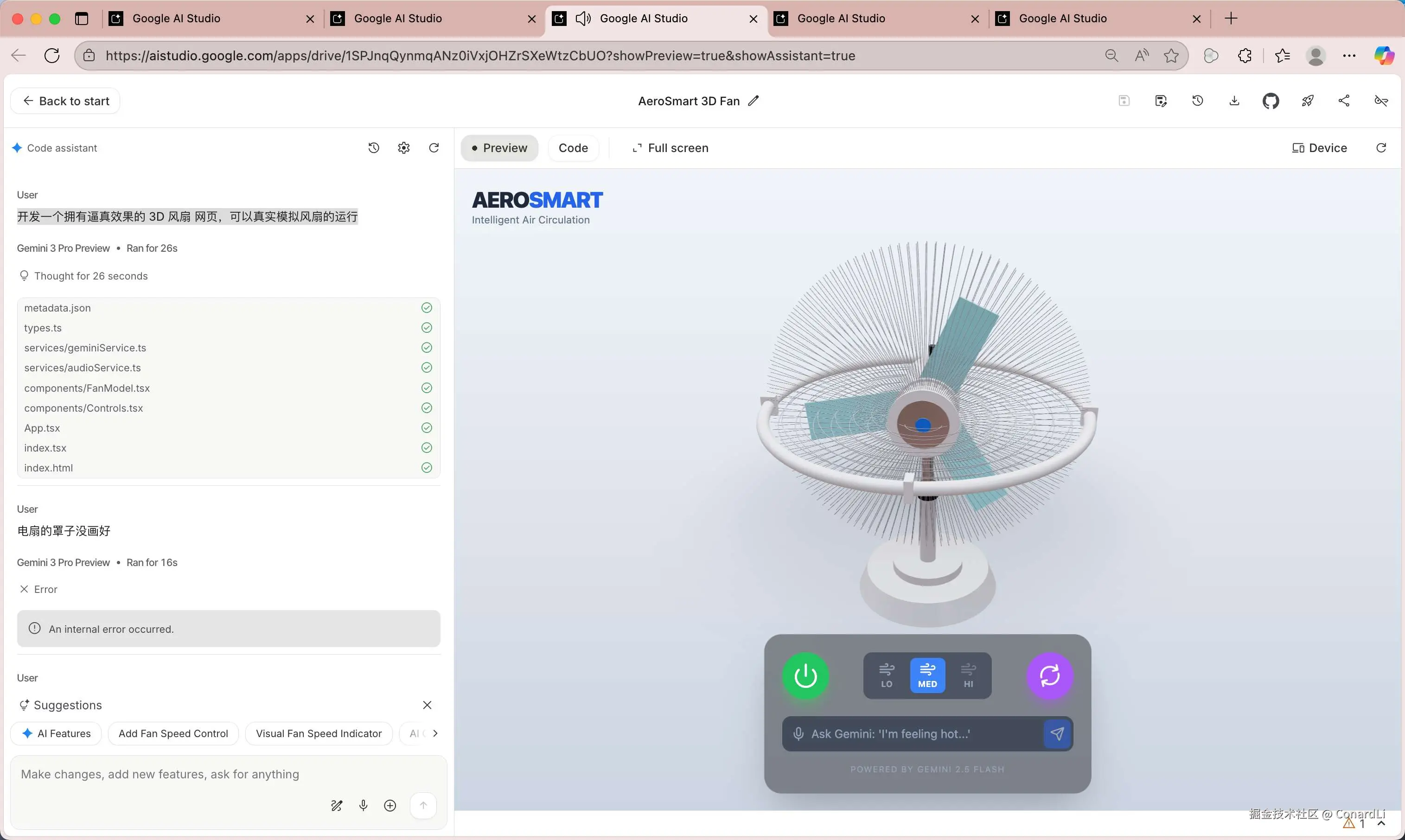 这个风扇生成的还是很逼真的,支持开关、调整风扇转速、摇头。甚至还是个 AI 智能风扇,可以直接跟风扇语音对话让他自己决定如何调整转速 ...