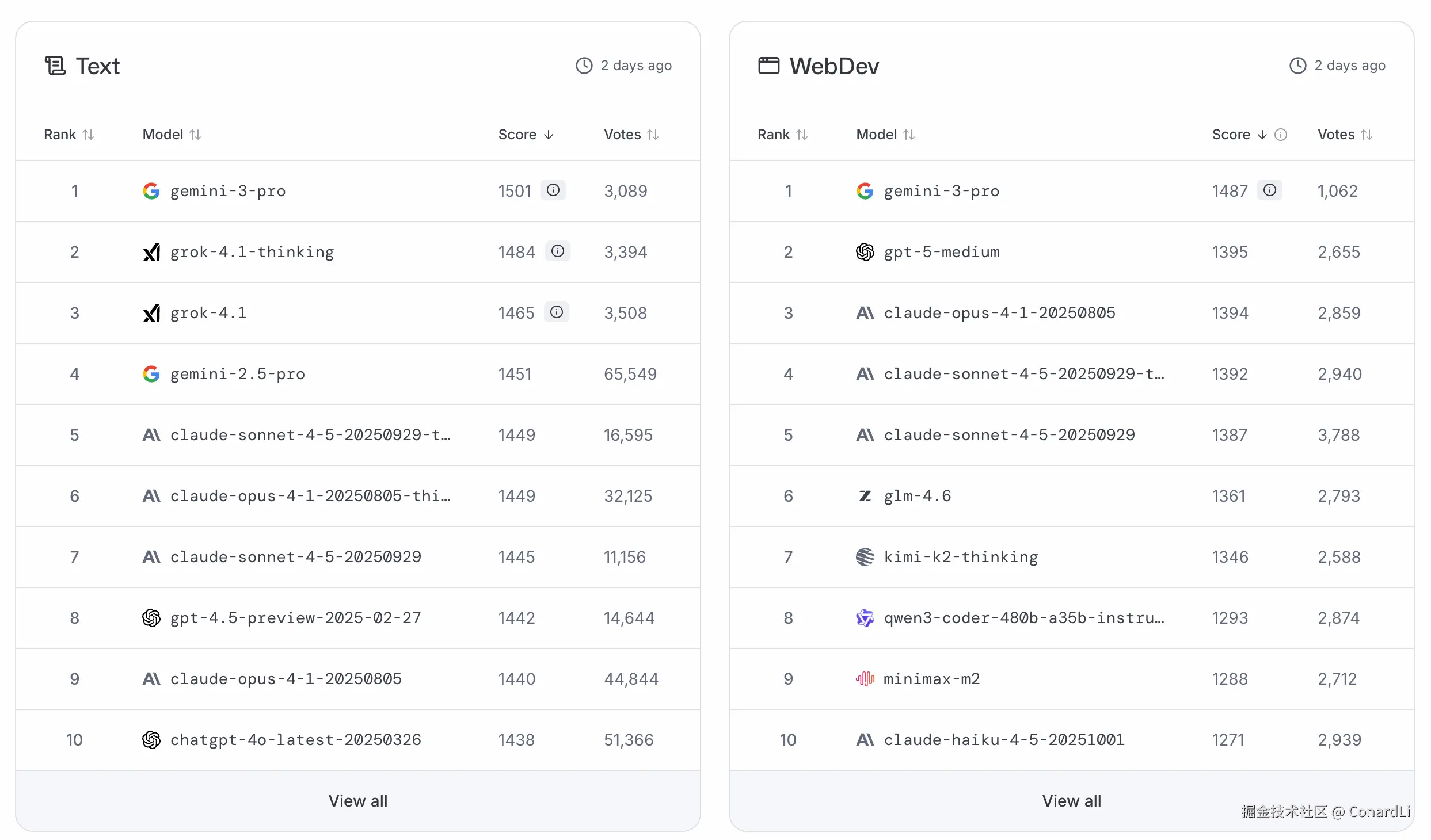 在 LMArena(大模型竞技场) 榜单中,Gemini 3.0 Pro 以 1501 Elo 的积分空降第一,这是人类历史上首个突破 1500 分大关的 AI 模型!