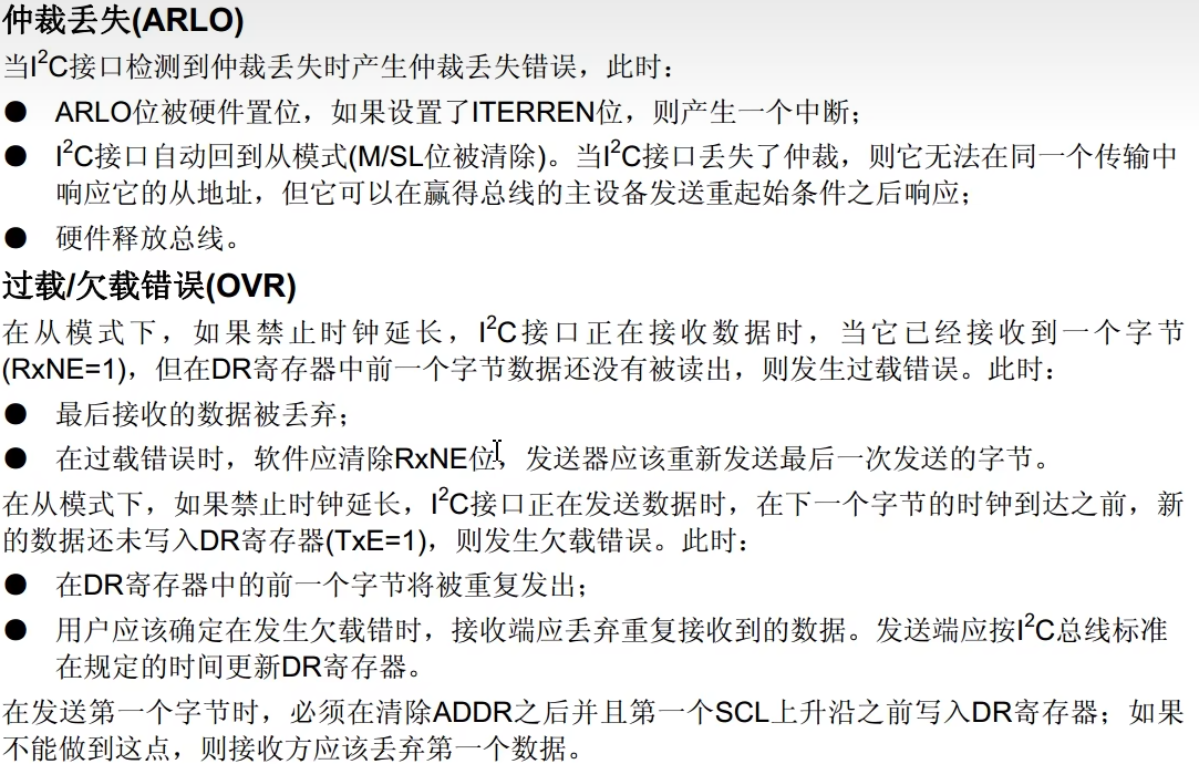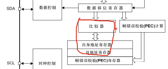 数据收发之后这里还有两个功能,一个是比较器和自身地址寄存器,双地址寄存器。另一个是帧错误校验(PEC)计算和帧错误校验(PEC)寄存器。