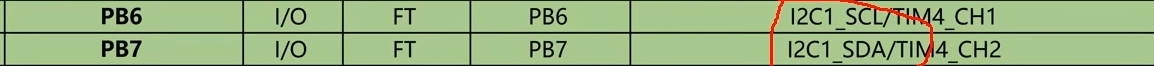 然后I2C1的SCL和SDA复用在了PB6和PB7两个引脚,