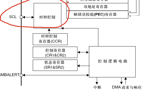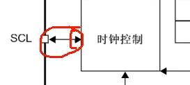 我们看SCL这部分。看着没啥东西,时钟控制就是用来控制SCL线的,至于控制的细节这里没有画,就把他当作一个黑盒子,在这个时钟控制寄存器写一个相应的位,电路就会执行对应的功能。
