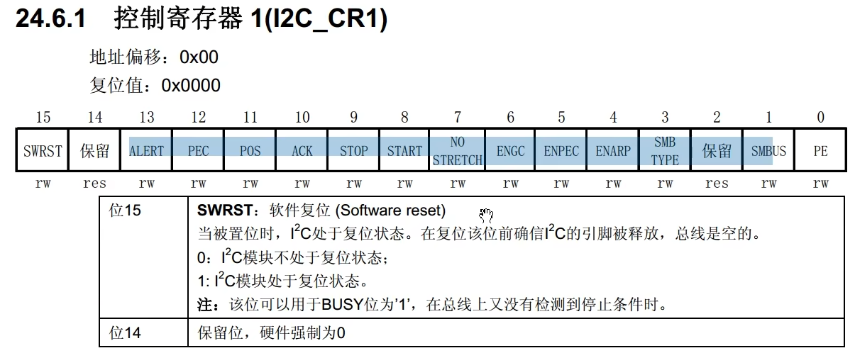我们过一遍流程,首先初始化之后,总线默认空闲状态,STM32默认是从模式,为了产生一个起始条件,STM32需要写入控制寄存器。这个需要看一下手册寄存器描述。