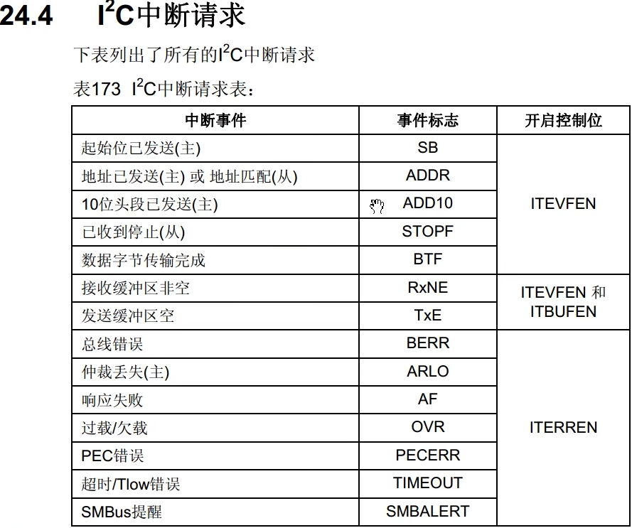 手册中都是用EV几这个事件来代替标志位的,为什莫要设置这个EV几事件。而不直接说产生什么标志位呢。这是因为,有的状态会同时产生多个标志位,所以这个EV几事件,融合了多个标志位的一个大标志位。在库函数中也有对应的检查EV几事件是否发生的函数。所以就当成一个大标志位理解就可以。