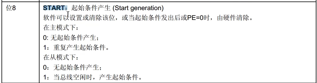 在控制寄存器CR中有一个START位,在这一位写1,就可以产生起始条件了。当起始条件发出后这一位可以由硬件进行清除,所以只要在这一位写1,STM32就自动产生起始条件了。之后STM32由从模式转为主模式,也就是多主机模型下,STM32有数据要发就要跳出来,这个意思。