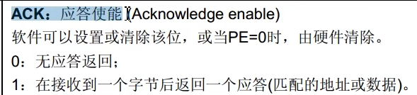 也是看手册,控制寄存器CR1里,有一个ACK应答使能,如果写1,再接收一个字节后,就返回一个应答。