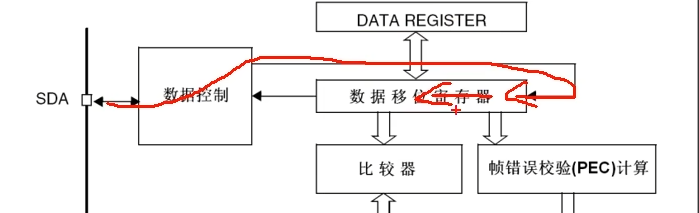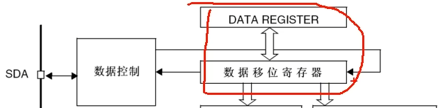 上面是SDA,是我们的数据控制部分,这里数据收发的核心部分是数据寄存器和数据移位寄存器