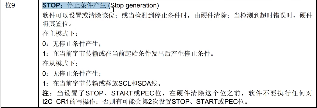 控制寄存器CR1中,这一位的STOP写入1就会在当前字节的传输,或当前起始条件发出后产生停止条件。