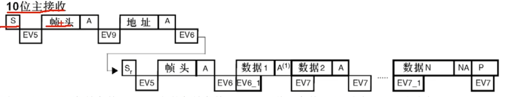 10位地址就复杂一些,起始--发送帧头(这里帧头的读写位应该还是写的)因为后面还要跟着发送第二个字节的地址--发送第二个字节八位地址--(要想转入读的时序,还要再发送起始条件--发送帧头(这时帧头的读写位就是读的了)因为发送读的指令,必须立刻转入读的时序,所以第二个字节的地址就没有了,直接转入接收数据的时序。