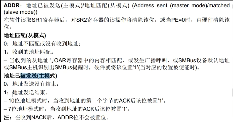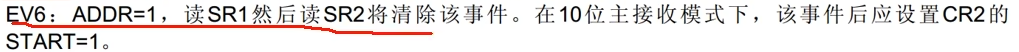 在寻址完成后后发生EV6事件,然后ADDR标志位,在主模式状态下,代表地址发送结束。