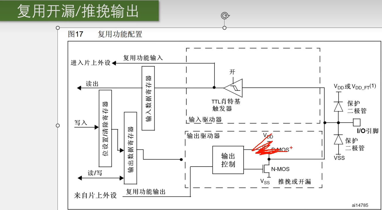 来到这个图可以看到,我们要使用复用开漏/推挽输出,上面的P-mos管是没有的。