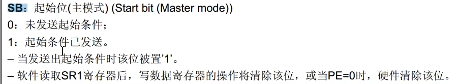 在状态寄存器SR1中可以找到这一位。SB为1时,代表起始条件已发送。写数据寄存器也就是DR我们接下来的操作,所以说状态寄存器是不需要手动清除的。
