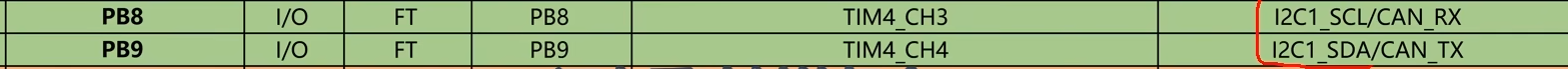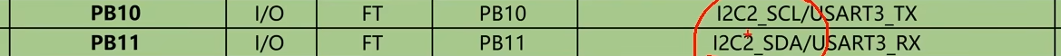 打开引脚定义表我们可以看到,I2C2的SCL和SDA接再励PB10和PB11端口。