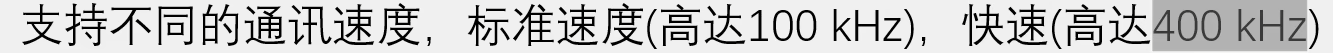 I2C协议的速度,如果某个设备声称支持快速I2C那么就是它的最大支持400KHz的时钟频率。当然作为一个同步协议,这个时钟并不严格,所以你只要不超过这个最大的频率多少都可以。
