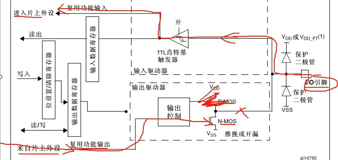 移位寄存器输出就接再了这个位置。这里写的就是来自片上外设的复用功能输出。所以I2C的外设就接在这里,之后控制N-MOS的通断进而控制这个I/O引脚。