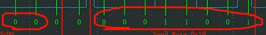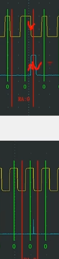 首先从两个引脚电平变化的趋势来看,这两个引脚波形都是一样的,对应的数据也都是一样的。