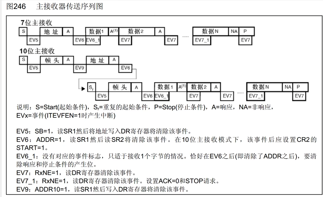 最后当我们不需要接收时候,需要再最后一个时序单元发生时,提前把刚才的应答位控制寄存器清0。并且设置终止条件请求,这就是EV7_1事件,然后在这个时序结束之后,由于设置了ACK=0,所以这里就会给出非应答,由于设置STOP位,所以产生终止条件。这样接收一个字节的时序就完成了。