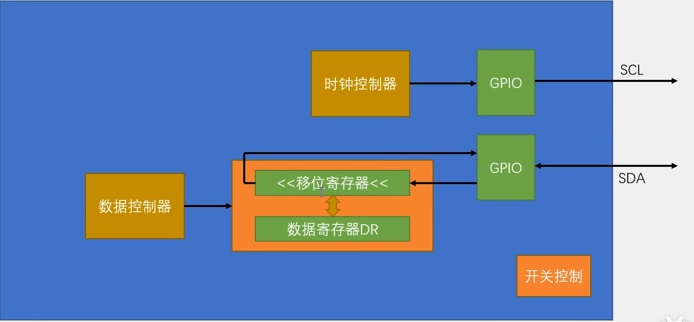 然后SCL这里时钟控制器通过GPIO去控制时钟线。这里简化为了一主多从的模型,所以时钟这里只画了输出的方向