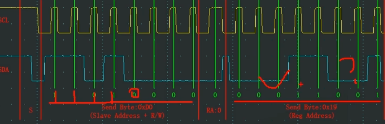 但是硬件这里,数据写入都是紧贴下降沿的,这里SCL下降沿,SDA立马就切换数据了,再读的时候也是。