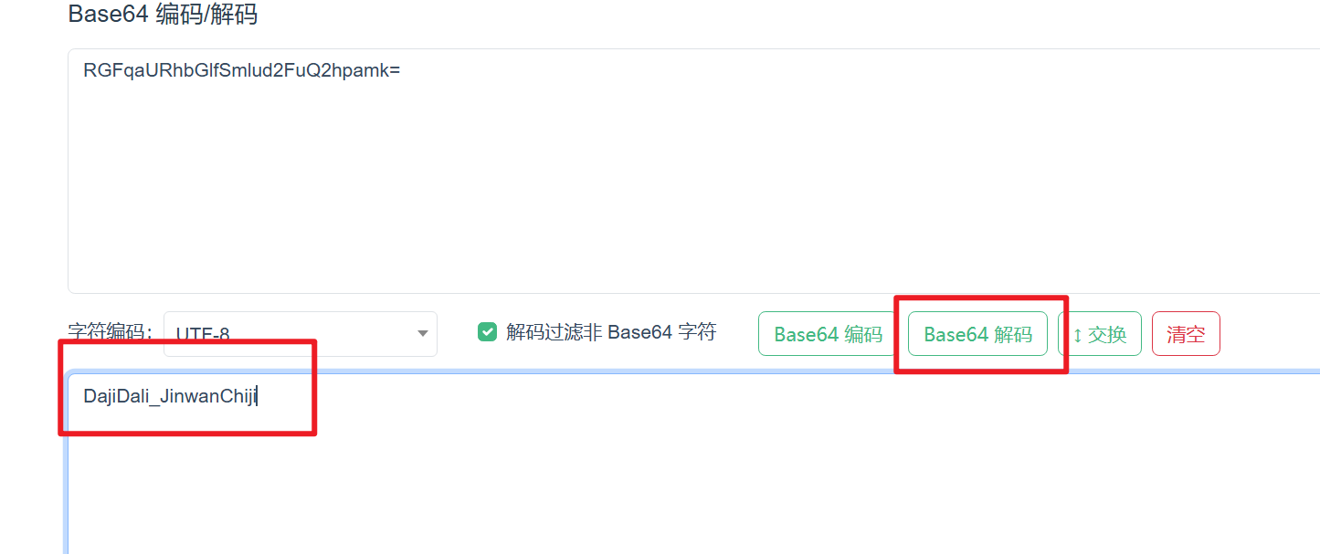 flag{RGFqaURhbGlfSmlud2FuQ2hpamk=} 复制下来提交发现不对 看了下wp才知道flag中的字符串被加密了,需要用base64解密