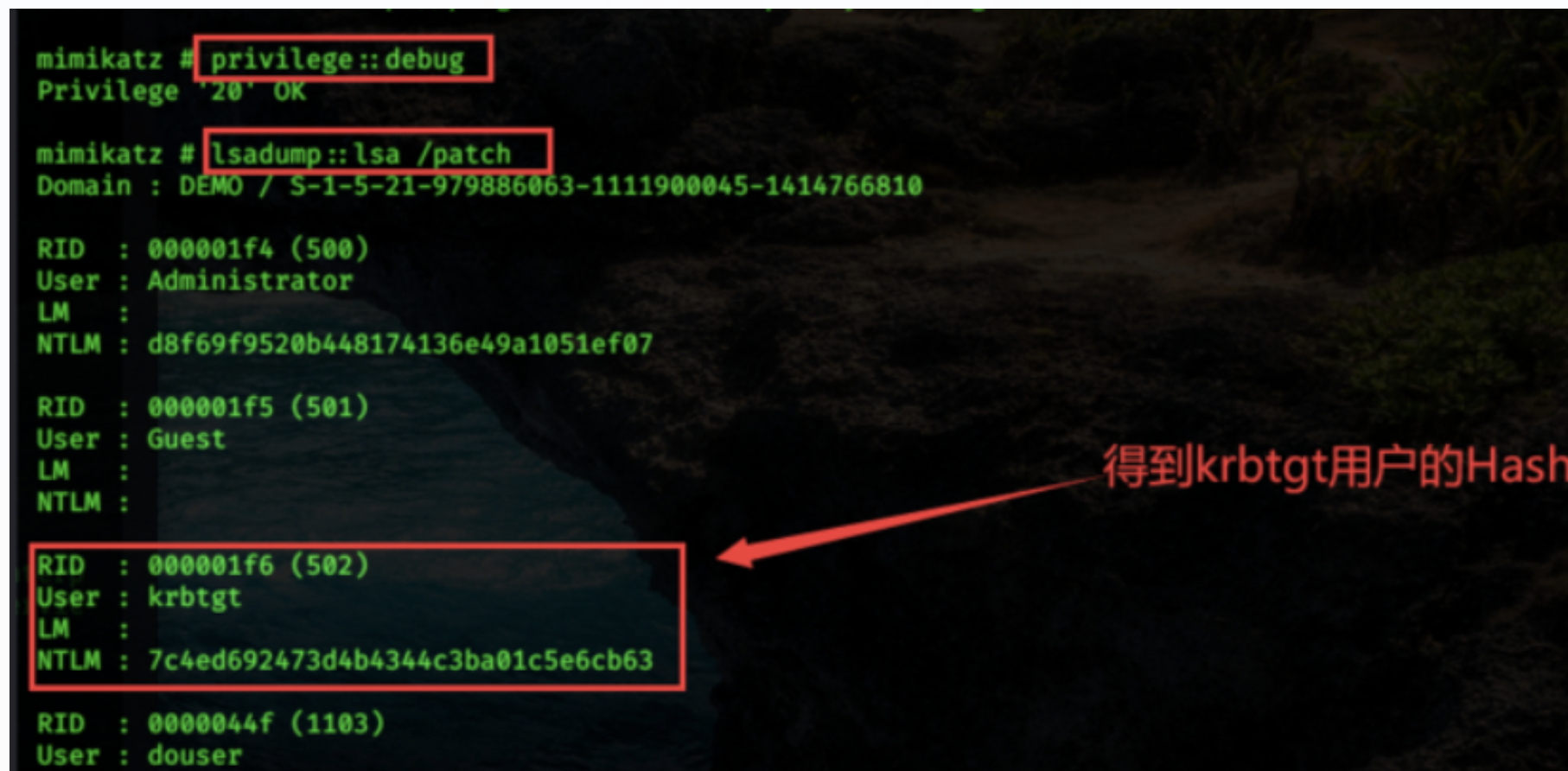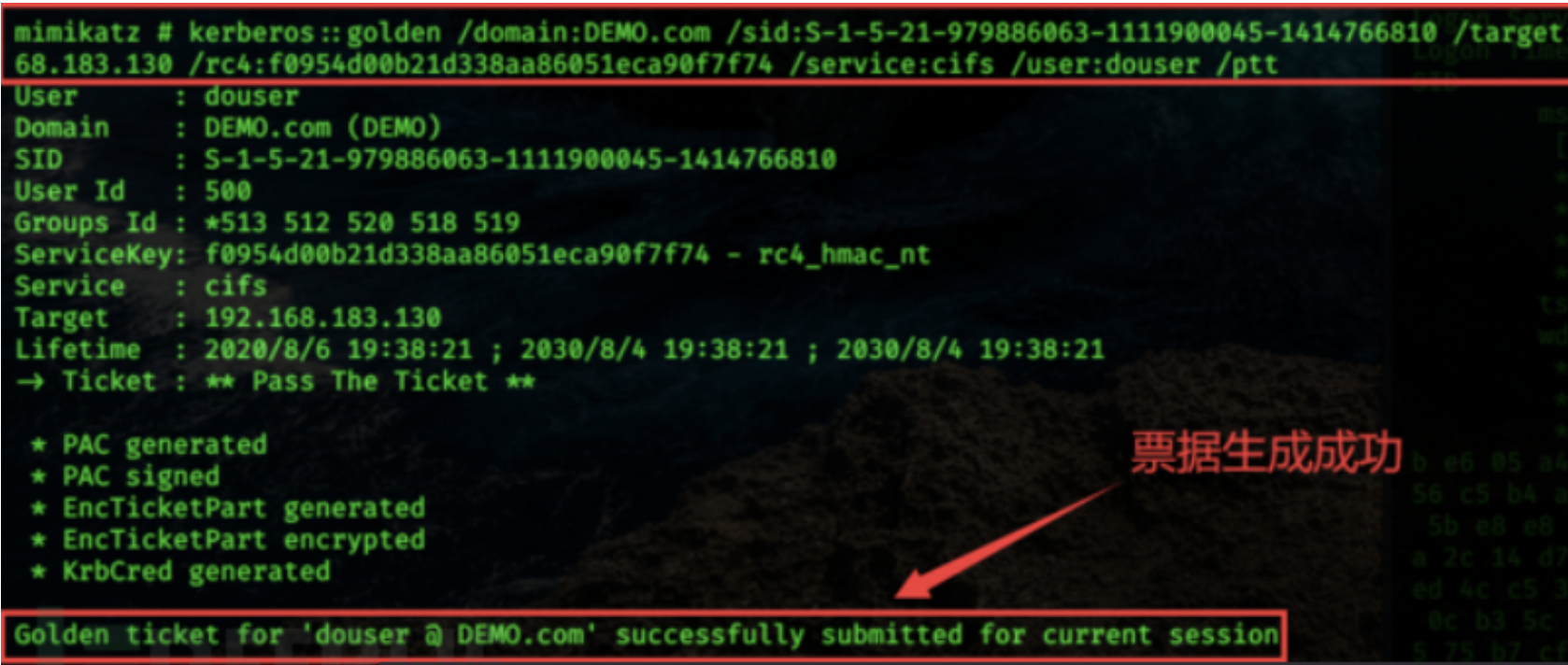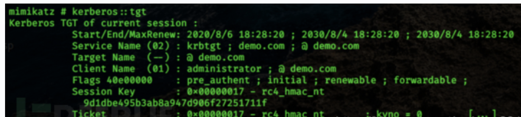 - 第二部分:生成票据授权票据TGT,TGT是由krbtgt hash加密的session key-TGS、user、client info、lifetime、timestamp等信息组成。